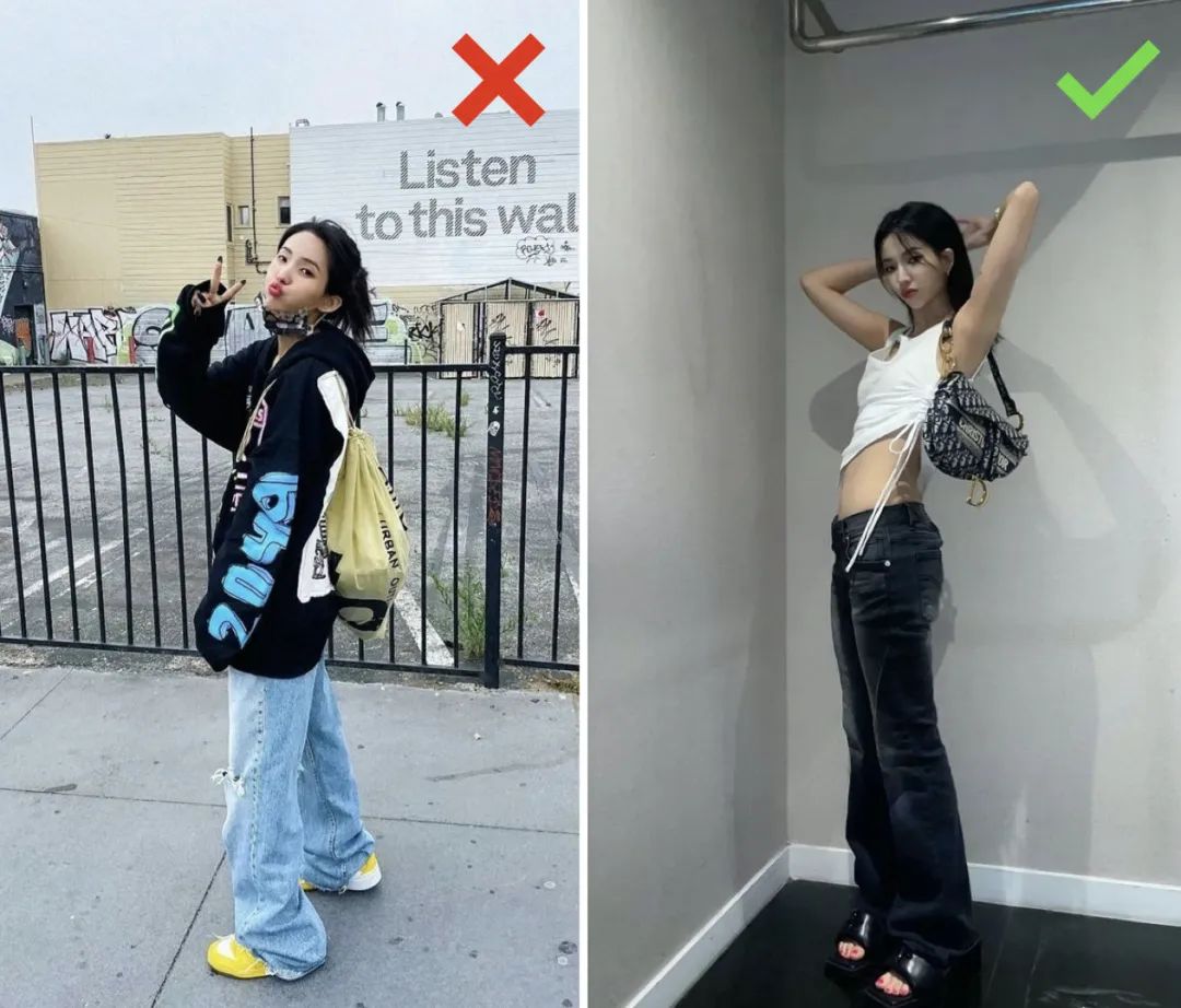 另外,领口不能太有包裹性,而且要避免过于宽松的版型,发挥不出身材优势不说,还会特别显肩宽背厚。