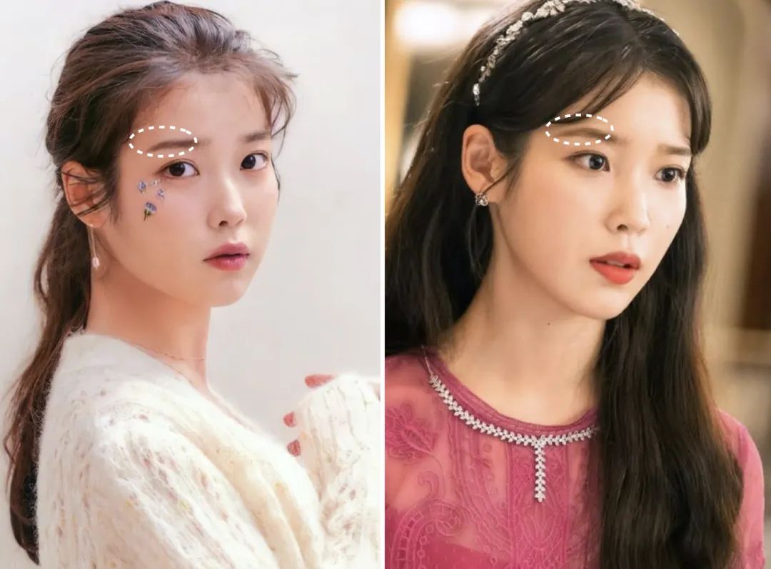 IU 的眼妆虽说不是很浓烈,但该有的精致度一点都少不了。她的眼影基本都是以大地色、暖杏色为主,不会有过多华丽亮片的堆叠,主要是晕染出轮廓,加强深邃度就够了。