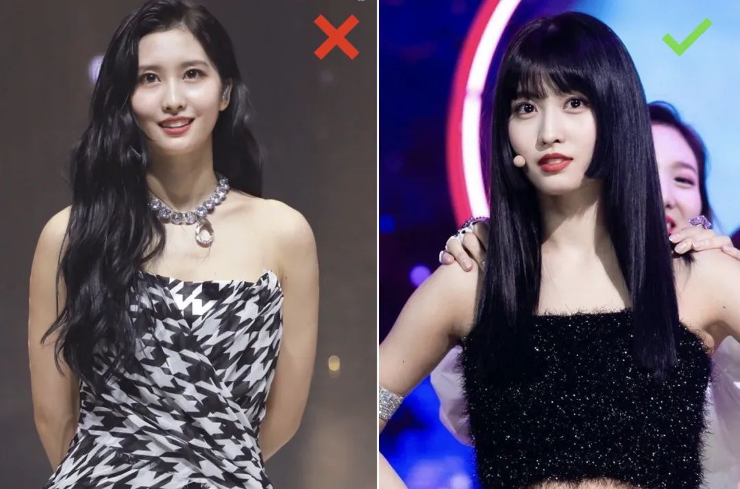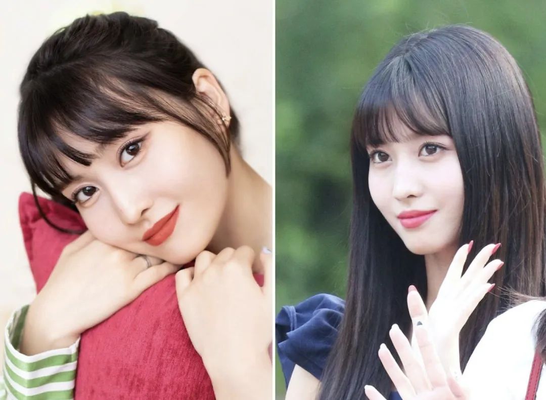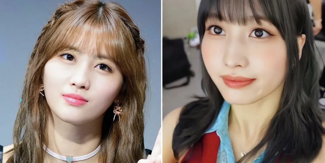 齐刘海长碎发修饰脸型我们前面说了momo的颧骨偏高,而且额头偏窄,所以她现在基本上都是利用刘海来修饰脸型。