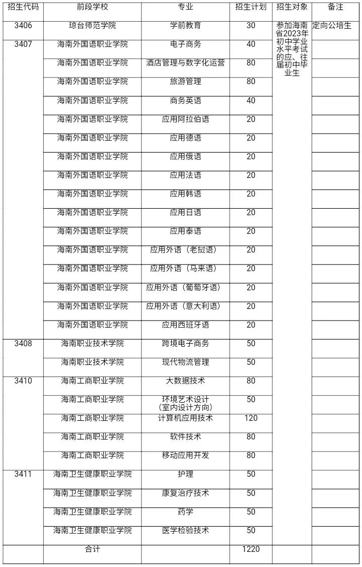 为推动我省高中阶段教育事业和高等职业教育科学发展,根据我省经济社会发展需要和各有关学校的办学条件、定位和发展需求,海南省教育厅结合人口、生源变化趋势,制定了海南省2023年高中阶段教育和五年一贯制高等职业教育招生计划。现将招生计划下达给你们,请认真贯彻执行,并做好招生入学等相关工作。