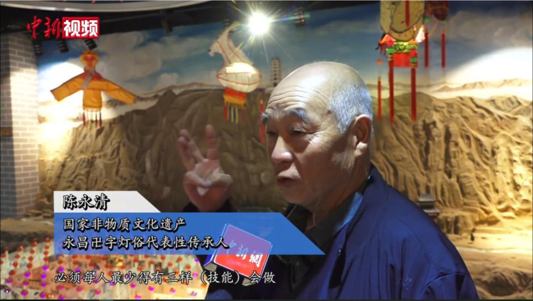 国家非物质文化遗产永昌卍字灯俗代表性传承人 陈永清做灯阵这个技艺,既要剪纸又要绘画又要会写(书法)又要会制作(灯笼),必须每人最少得有三样(技能)会做,我才能收他为徒弟。卍字灯里面蕴藏着我们本地的社会习俗,仁义礼智信道德方面的习俗,所以这些东西丢掉我就觉得有点可惜,所以就一直坚持(制作和传承)。
