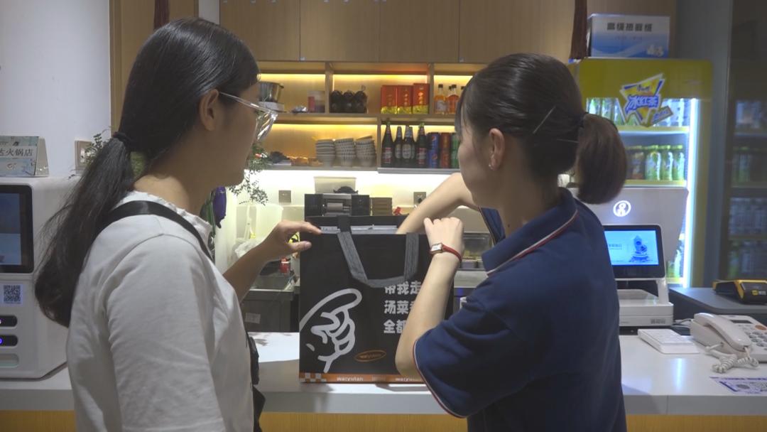 晚上22点,迎来了餐厅结账的高峰期,记者看到从巴楚县回到喀什市和家人一起过节聚餐的杨珊珊在结账后正在将剩余的餐品打包带回家。喀什市民杨珊珊说 :“分量比较足,没有吃完,就想把它打包,因为勤俭节约是我们中华民族的传统美德。”