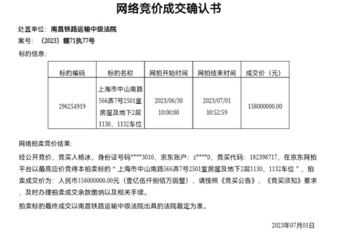 7月1日,京东房产拍卖页面显示,“上海市中山南路566弄7号2501室房屋及地下2层1130、1132车位”以1.58亿元的价格成交,较起拍价1.25亿元溢价26.4%。