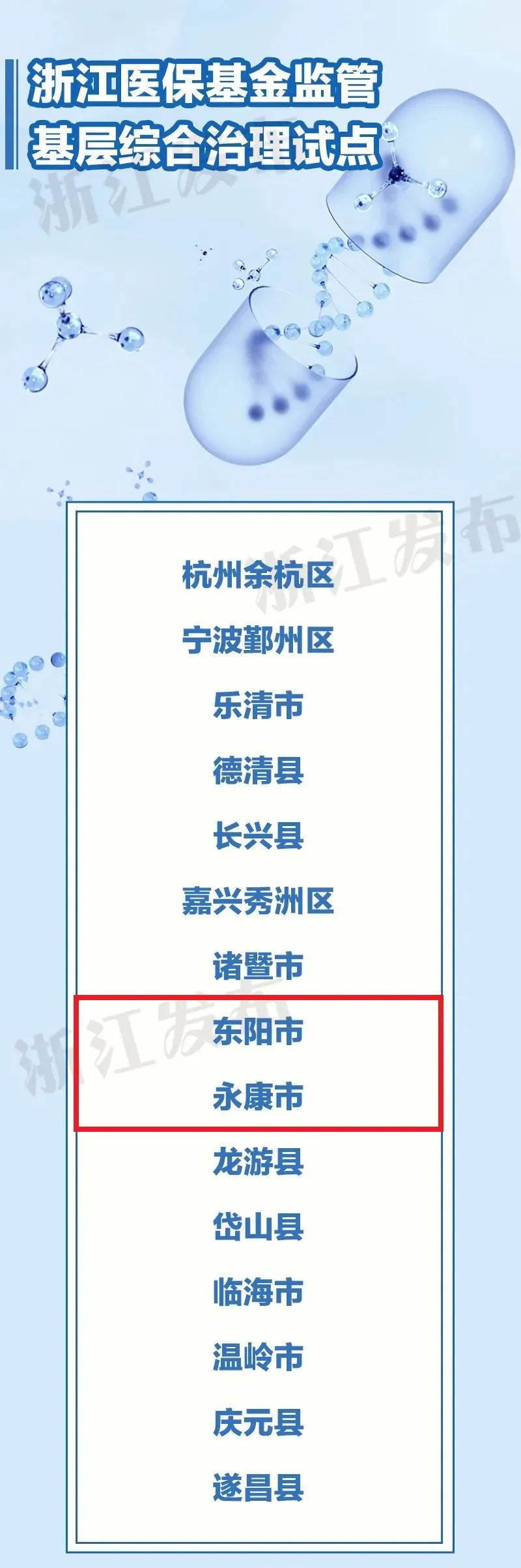 近日,浙江省医疗保障局印发《关于公布医保基金监管基层综合治理试点名单的通知》,确定首批共15个试点县(市、区)名单。其中东阳市、永康市入选,一起来看~