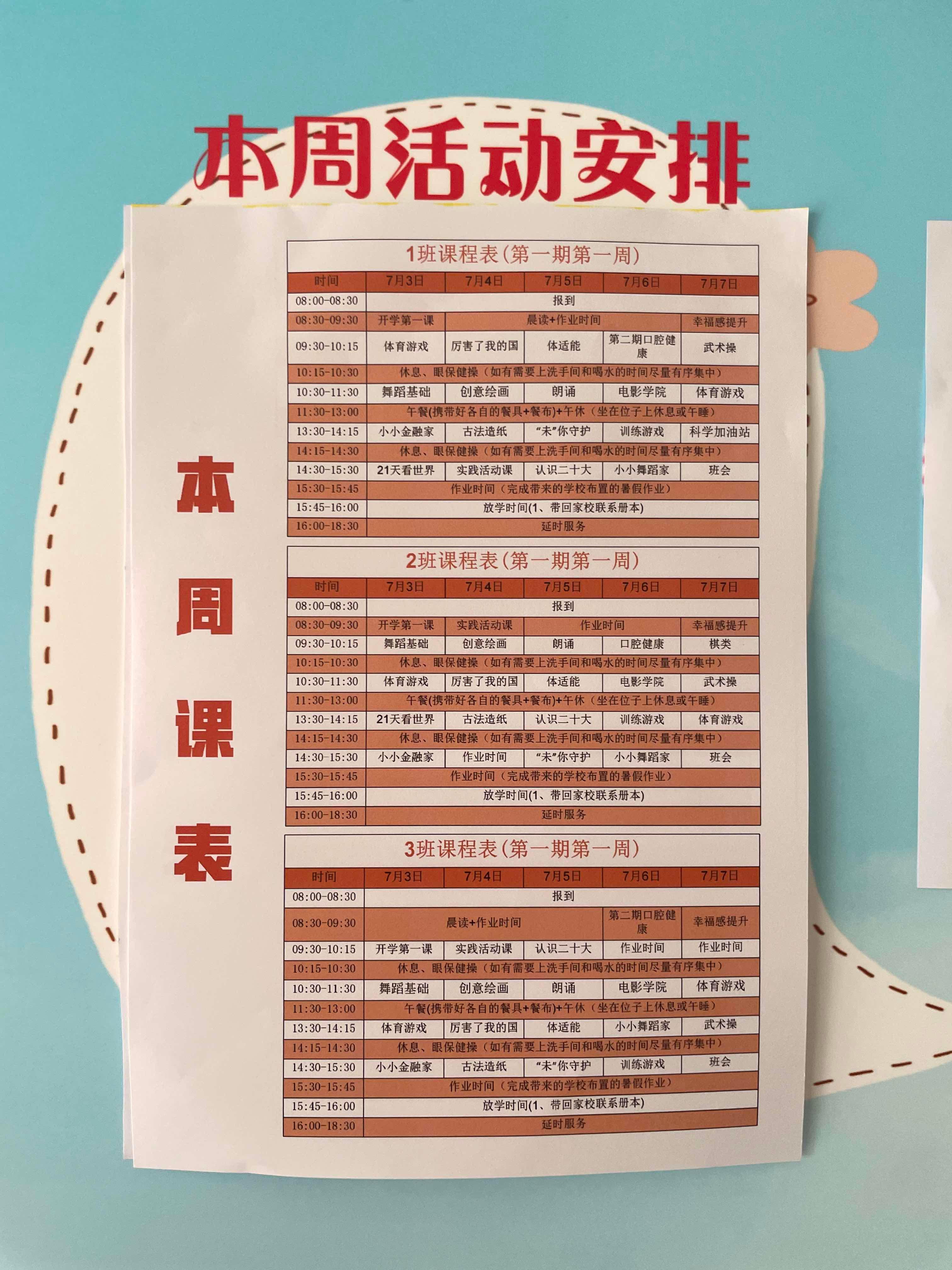 校园里张贴的课程表显示,课程包括:舞蹈基础、创意绘画、朗诵、电影学院、体育游戏、古法造纸等。同时结合虹梅街道科创特点,开设符合小学生身心发展特点的拓展课程,包括园区特色课程一一斯泰兰蒂斯绿色低碳课程“未来电动汽车”、国电科21所科普知识课程“航空航天是什么”、九点水美术馆馆长艺术修养课程“文物里的秘密”等。