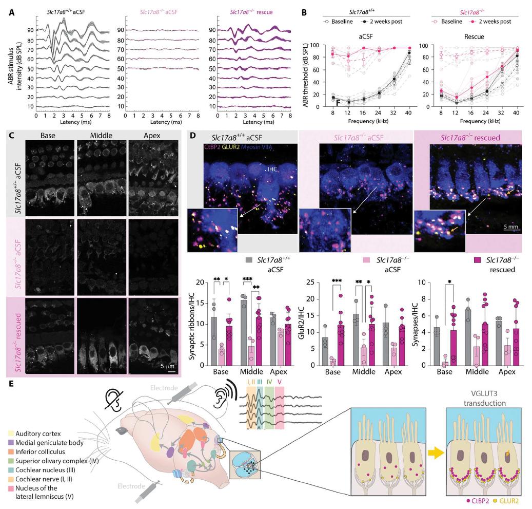 通过脑脊液递送表达slc17a8基因的AAV病毒可拯救人类耳聋小鼠模型的听力和听觉传入突触这项研究结果表明,通过脑脊液运输是将基因递送到成年动物内耳的可行途径,这可能是使用基因治疗恢复人类听力的重要一步。