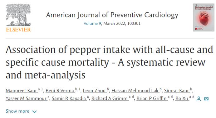 据了解,该研究于2021年3月发表在American Journal of Preventive Cardiology期刊上,文章名为“Association of pepper intake with all-cause and specific cause mortality - A systematic review and meta-analysis”,中文译作“辣椒摄入量与全因和特因死亡率的相关性——系统综述和荟萃分析”。