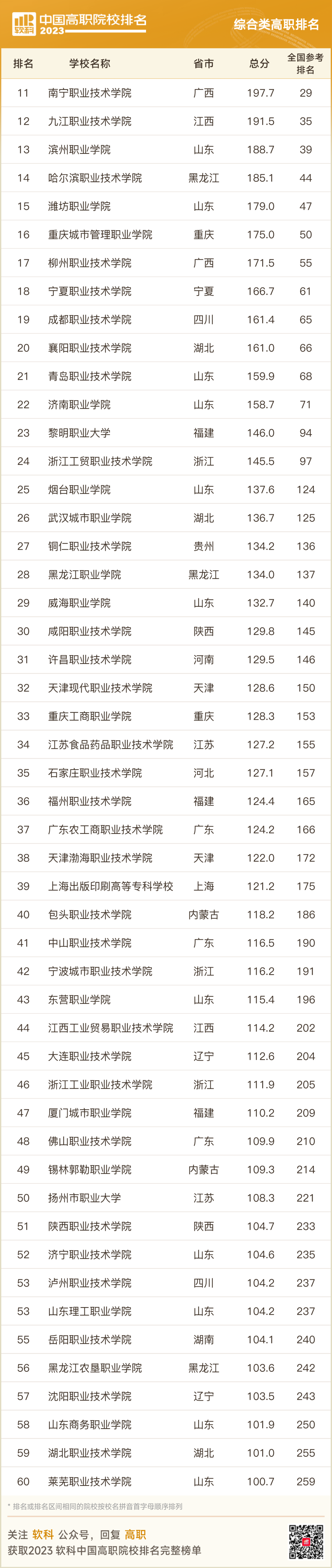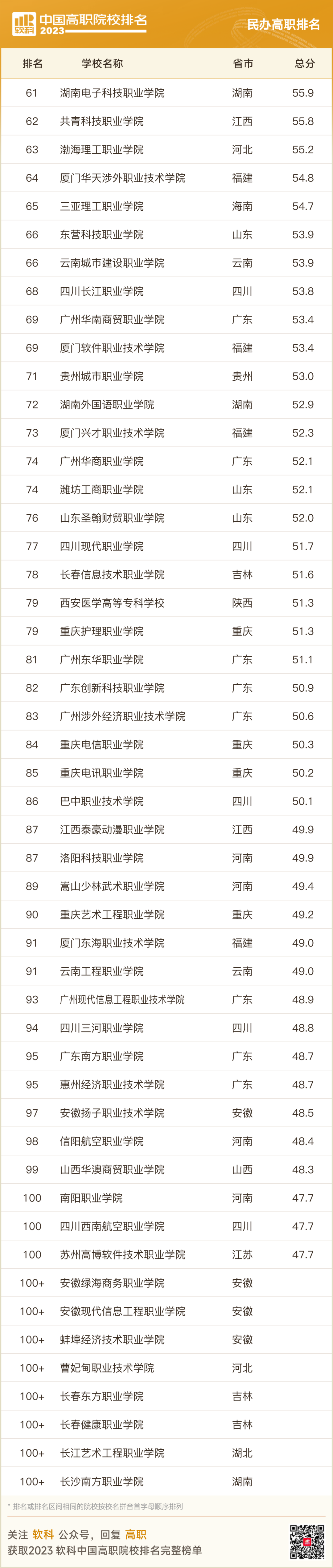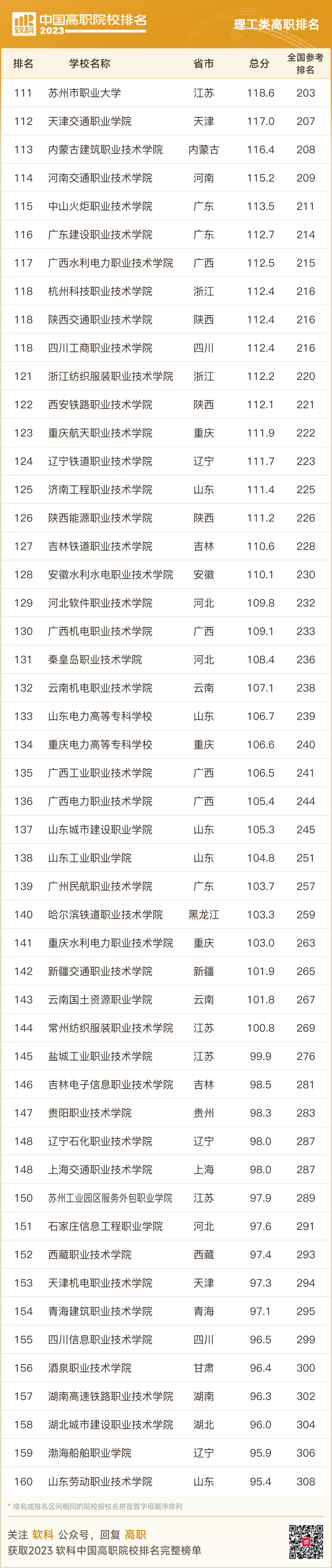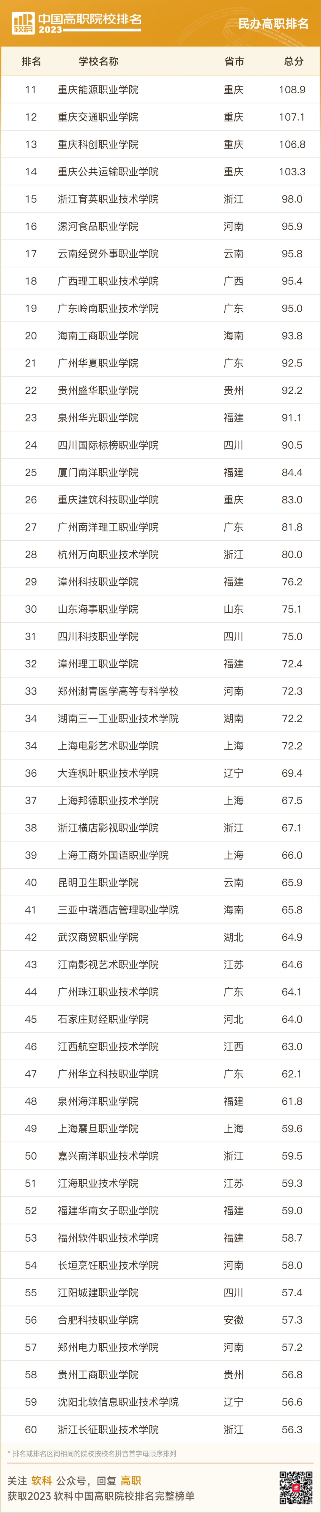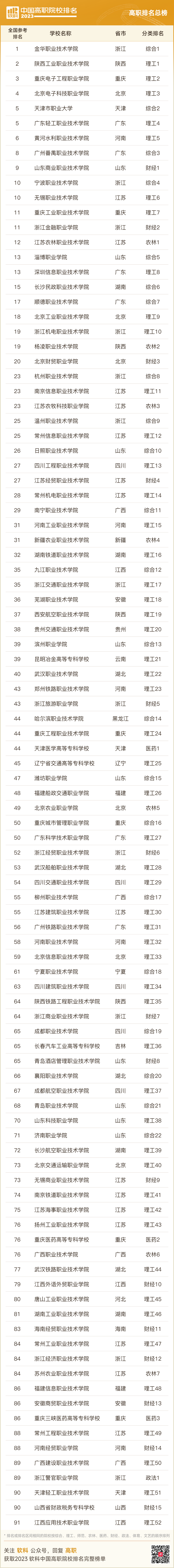 原标题:《重磅发布:2023软科中国高职院校排名》本文为澎湃号作者或机构在澎湃新闻上传并发布,仅代表该作者或机构观点,不代表澎湃新闻的观点或立场,澎湃新闻仅提供信息发布平台。申请澎湃号请用电脑访问http://renzheng.thepaper.cn。