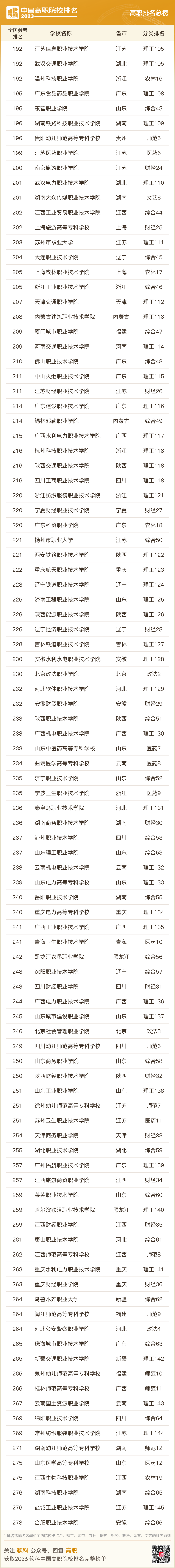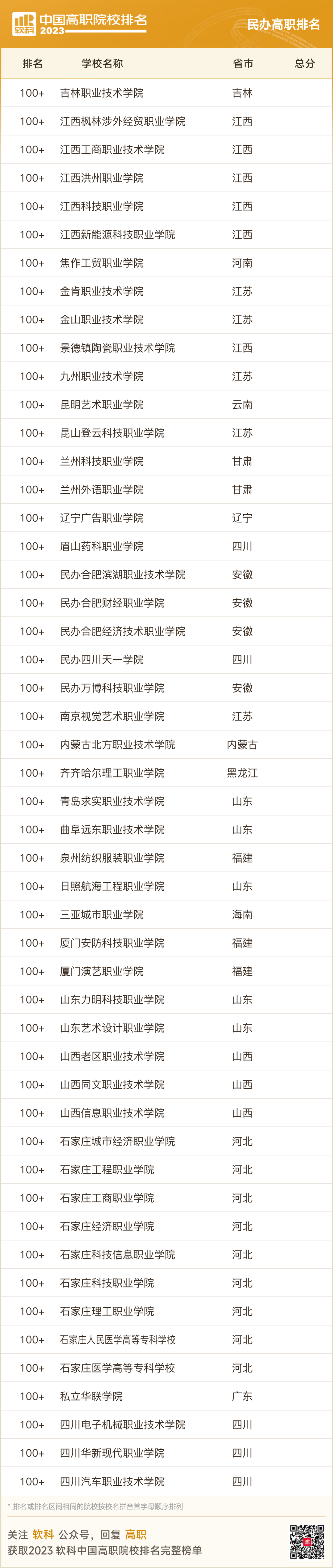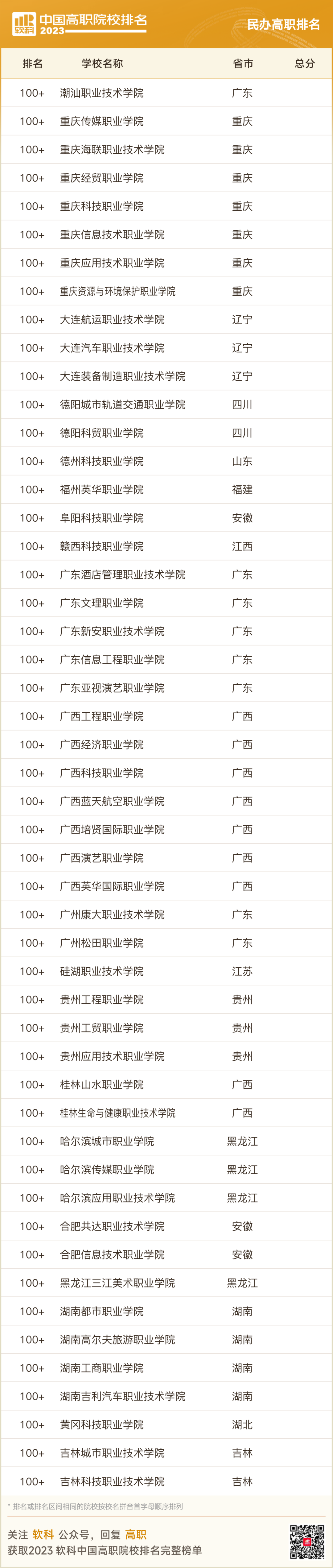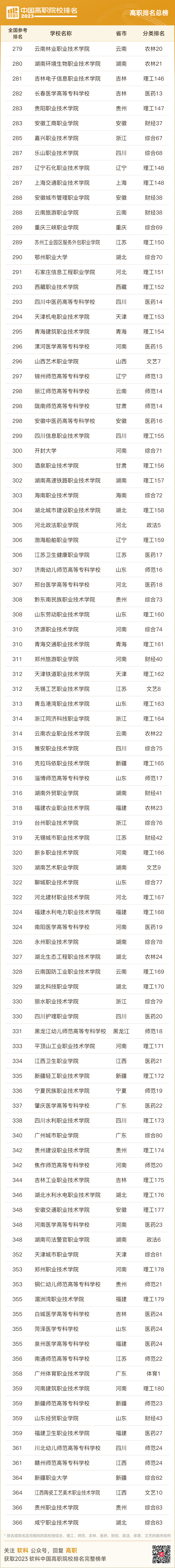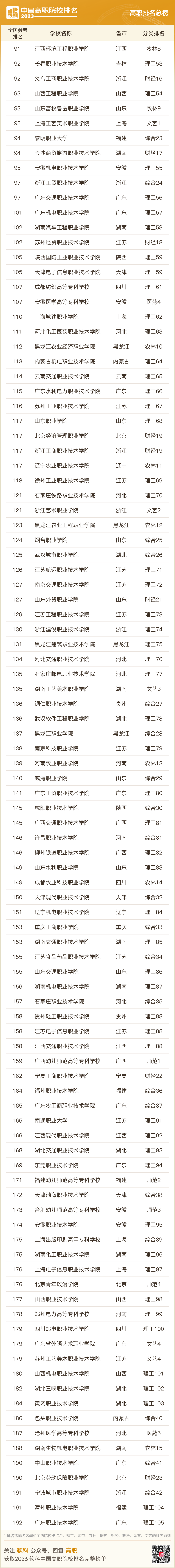 原标题:《重磅发布:2023软科中国高职院校排名》本文为澎湃号作者或机构在澎湃新闻上传并发布,仅代表该作者或机构观点,不代表澎湃新闻的观点或立场,澎湃新闻仅提供信息发布平台。申请澎湃号请用电脑访问http://renzheng.thepaper.cn。