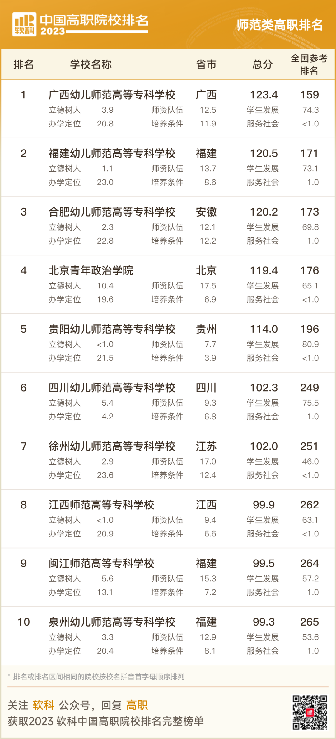 2023师范类高职院校排名的排名对象共83所,广西幼儿师范高等专科学校、福建幼儿师范高等专科学校、合肥幼儿师范高等专科学校位列前三。