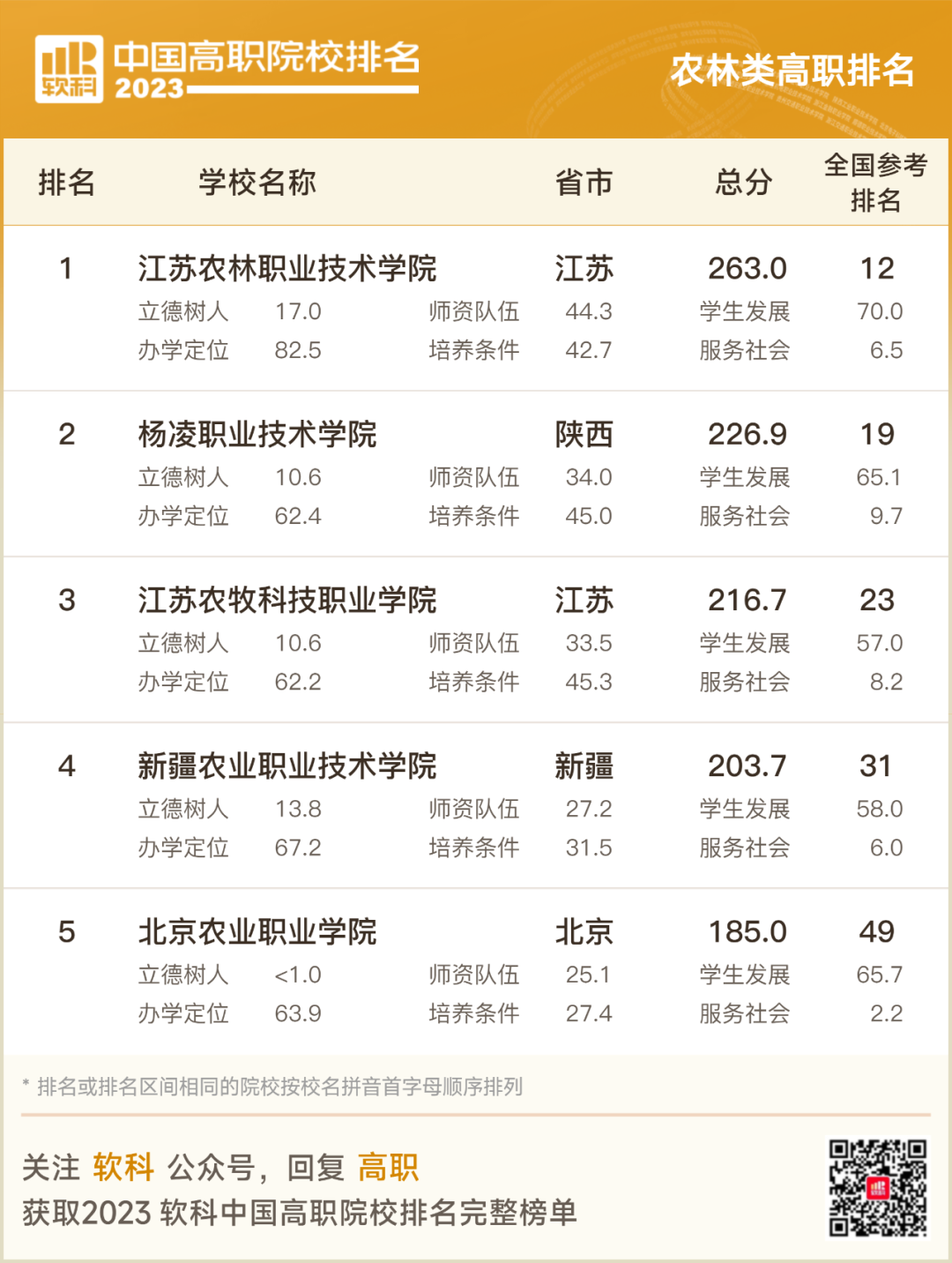 2023农林类高职院校排名的排名对象共51所,江苏农林职业技术学院、杨凌职业技术学院、江苏农牧科技职业学院位列前三。