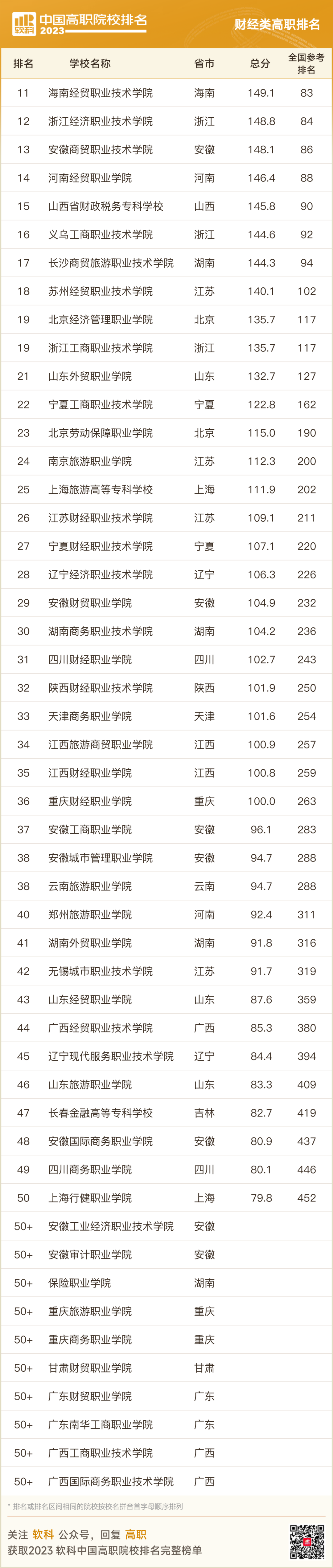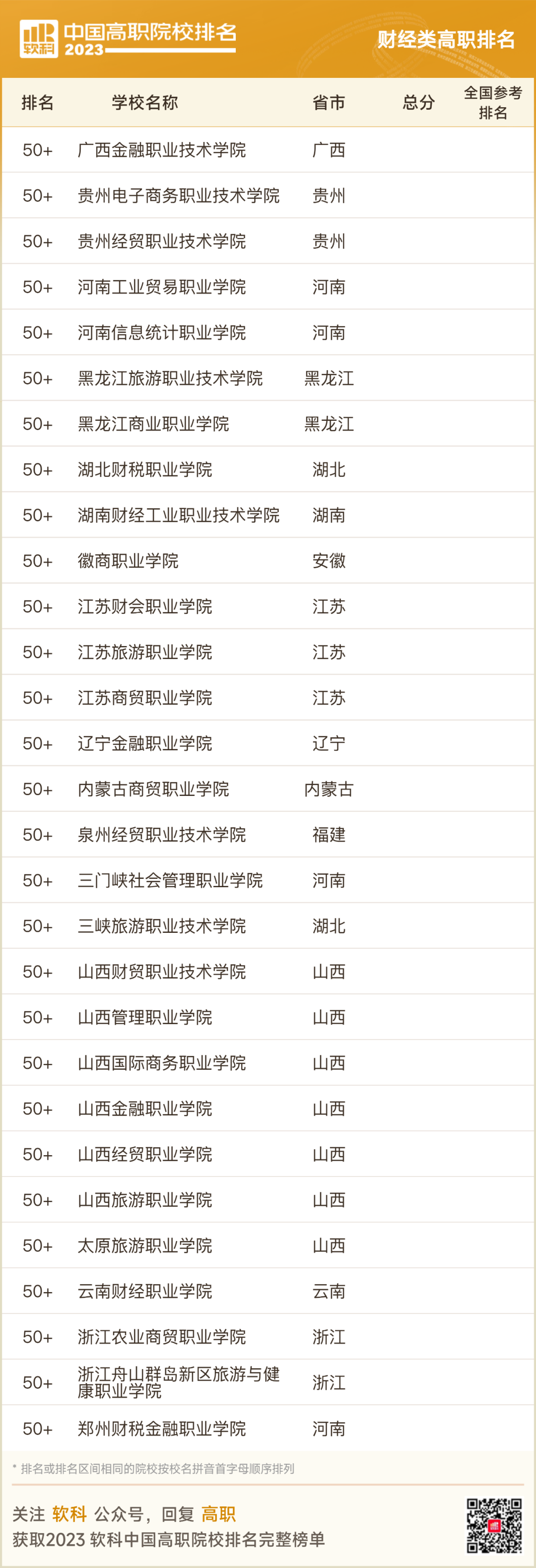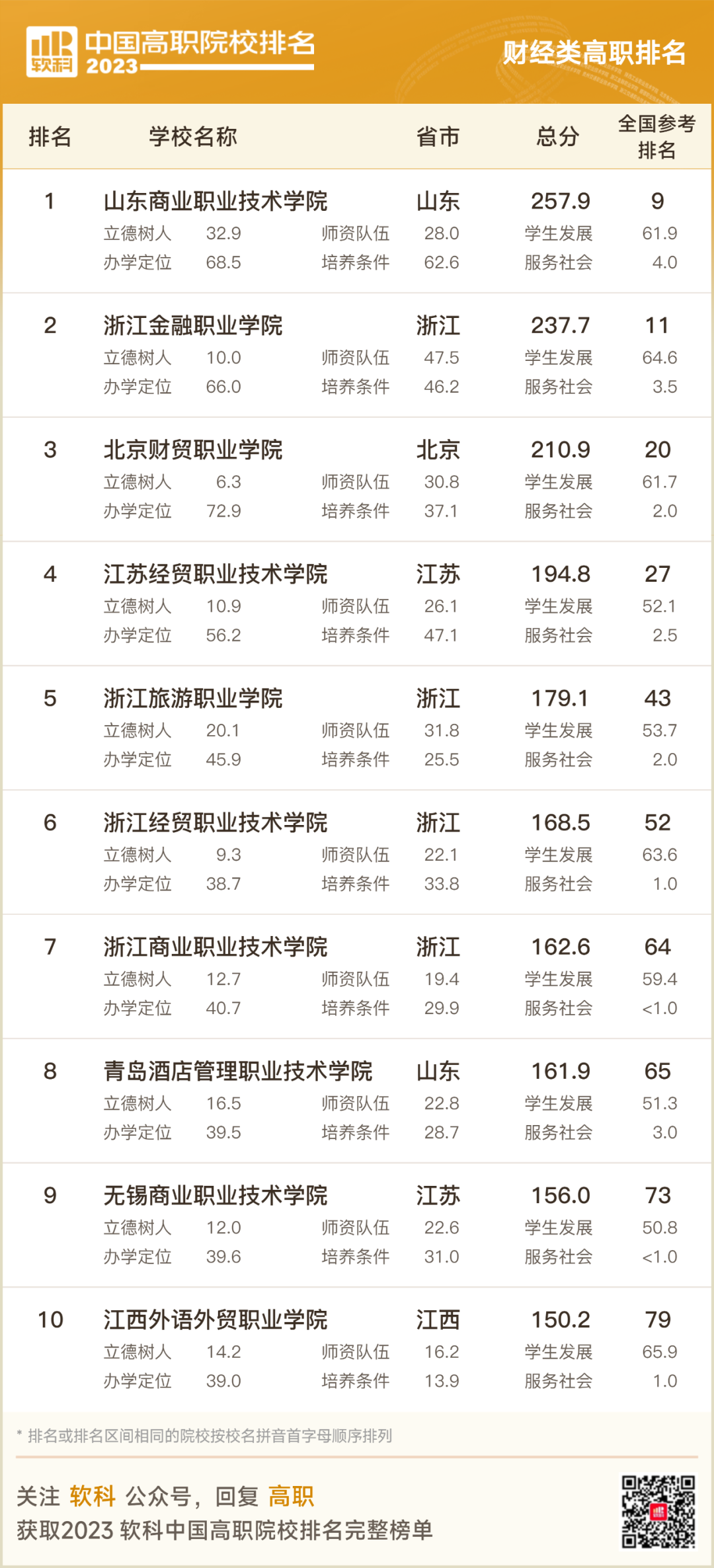 2023财经类高职院校排名的排名对象共89所,山东商业职业技术学院、浙江金融职业学院、北京财贸职业学院位列前三。