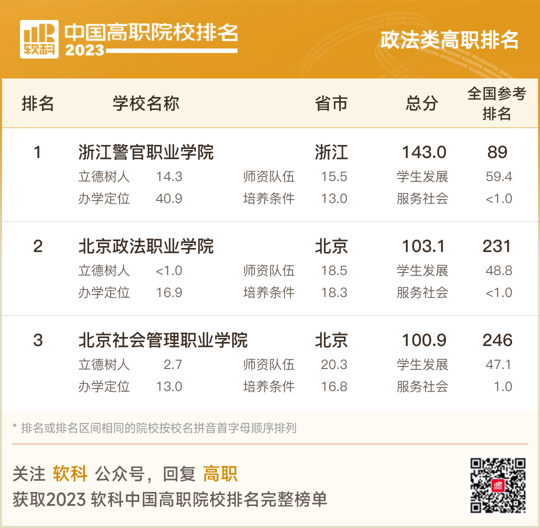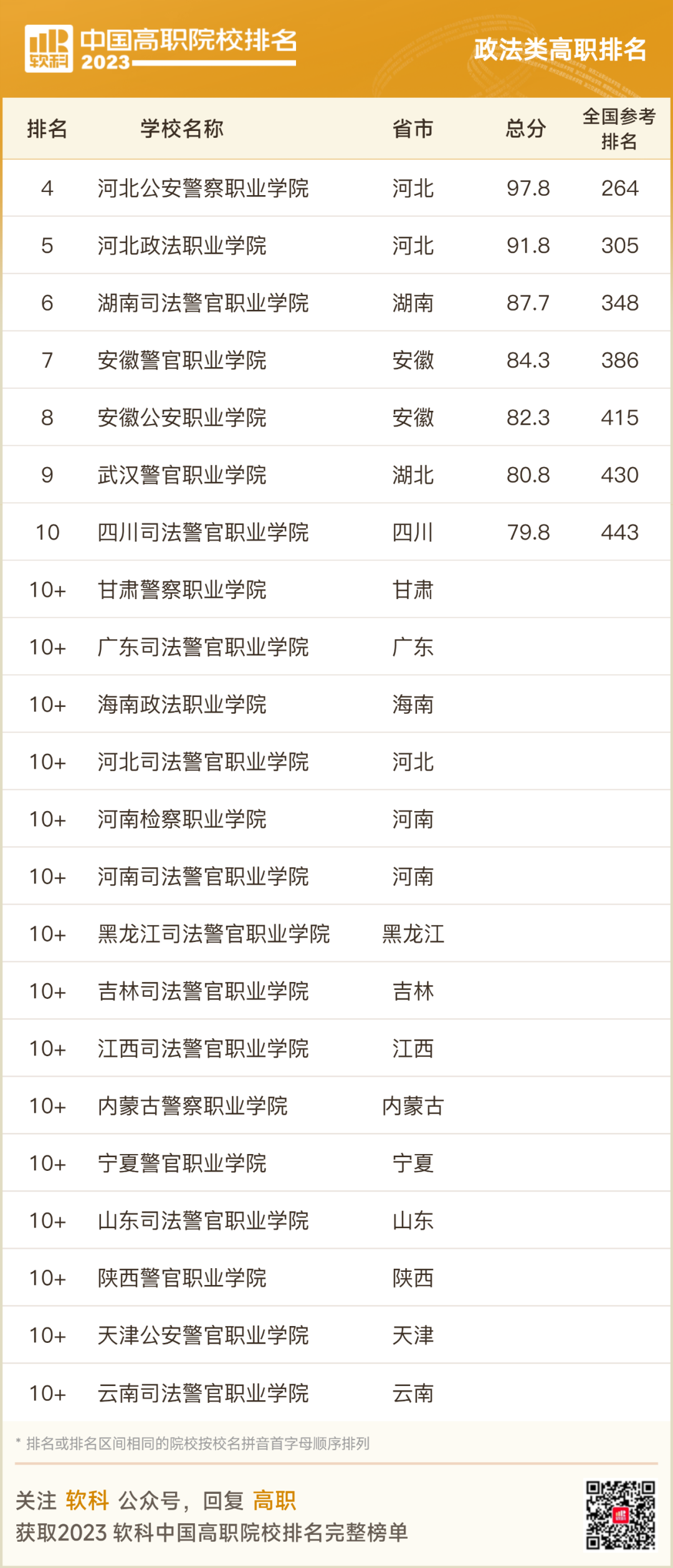 2023政法类高职院校排名的排名对象共25所,浙江警官职业学院、北京政法职业学院、北京社会管理职业学院位列前三。