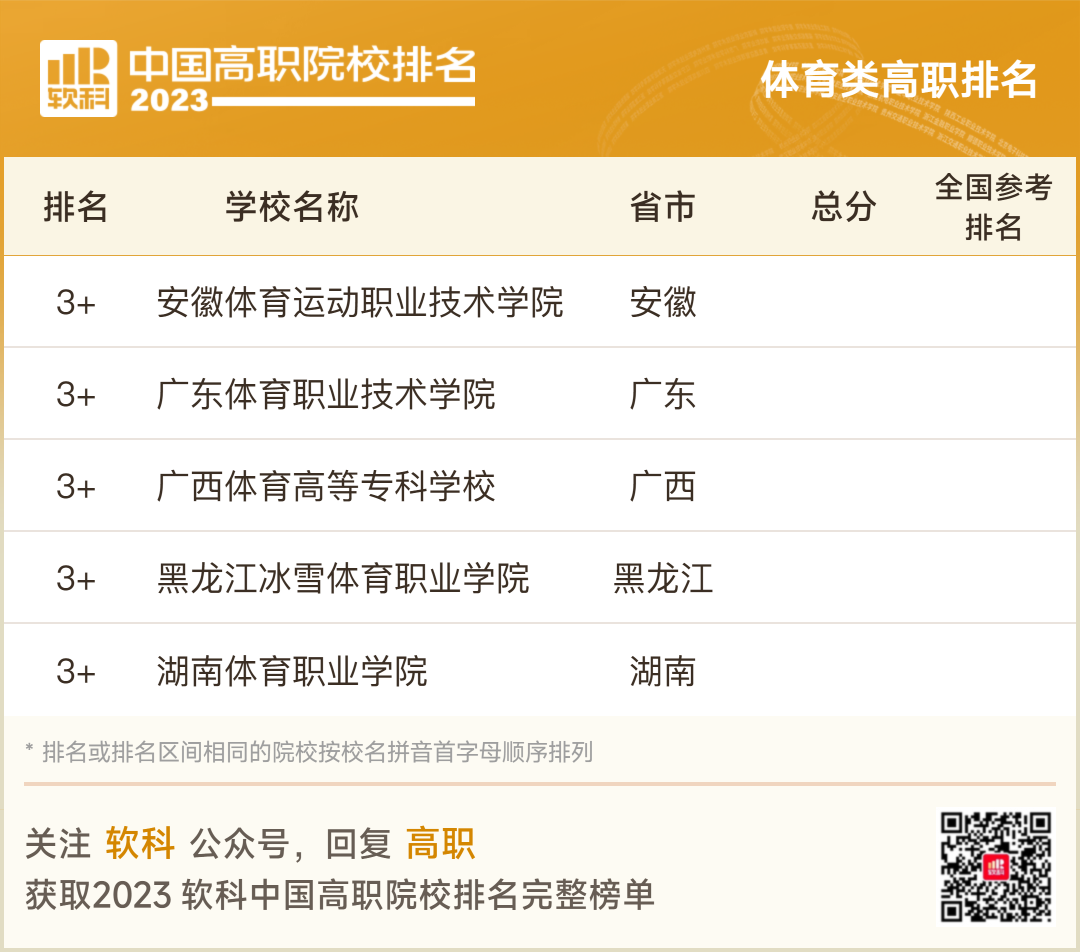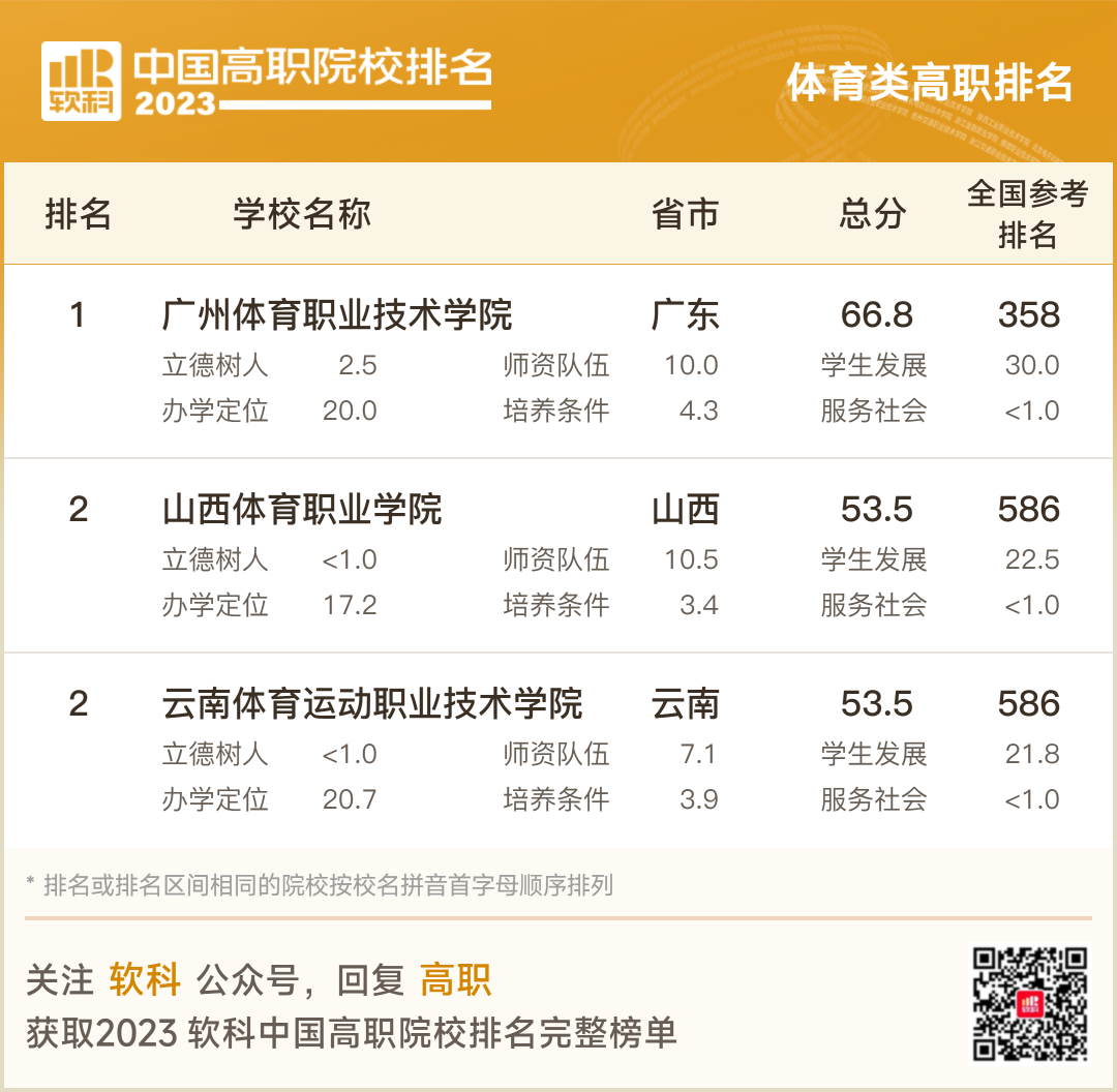 2023体育类高职院校排名的排名对象共8所,广州体育职业技术学院、山西体育职业学院、云南体育运动职业技术学院位列前三。
