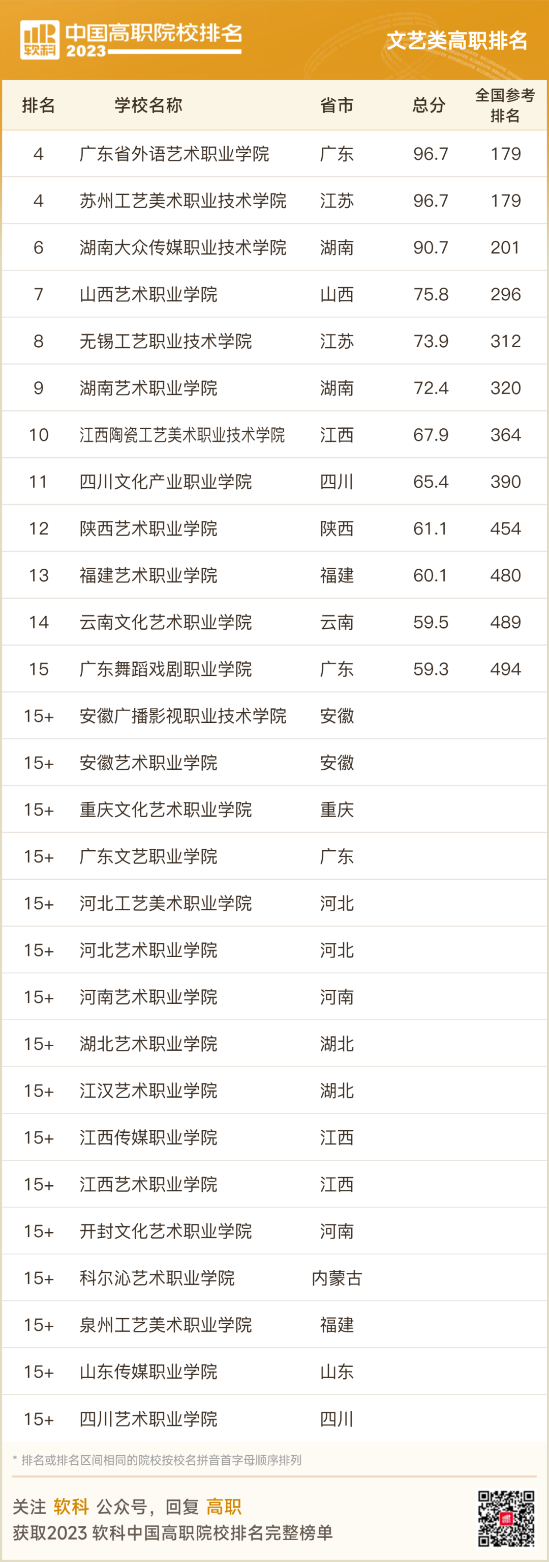 2023文艺类高职院校排名的排名对象共31所,上海工艺美术职业学院、浙江艺术职业学院、湖南工艺美术职业学院位列前三。