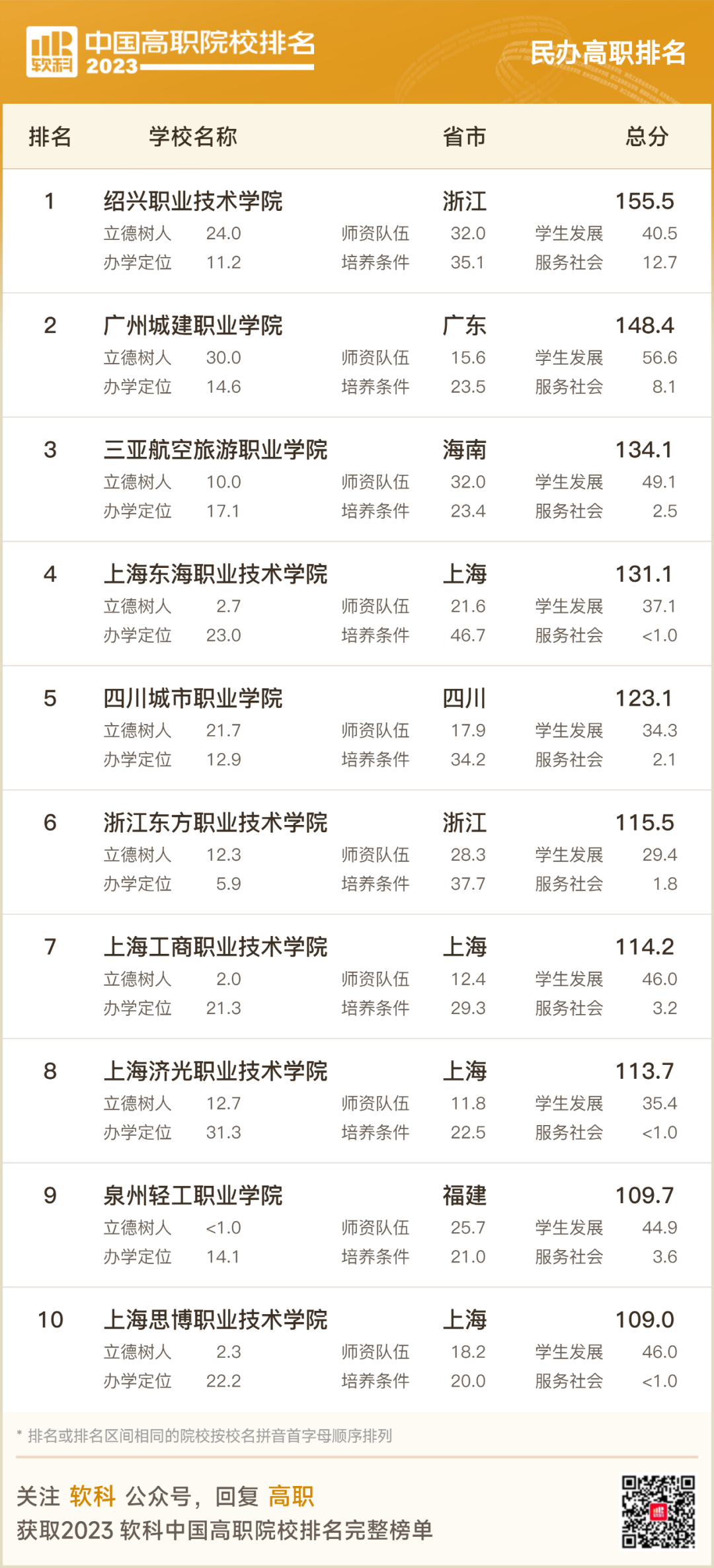 2023民办类高职院校排名的排名对象共253所,其中252为民办院校,1所为中外合作办学院校,绍兴职业技术学院、广州城建职业学院、三亚航空旅游职业学院位列前三。