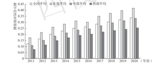 全国整体数字经济发展态势良好,整个“十二五”和“十三五”时期数字经济发展指数呈现“稳步上升”趋势。在地域尺度上,东部地区数字经济发展“一马当先”,中部地区增速保持高位运行,西部地区虽相对落后,与东中部地区存在较大差距,但长期向好特征明显。