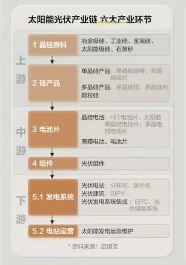 目前,我国太阳能光伏产业已经形成比较完整的产业链结构,主要分为晶体硅与薄膜电池两大类,产业链划分为晶硅原料、硅产品、电池片、组件、发电系统、电站运营等6个环节。上游为晶硅原料、硅产品环节;中游为电池片、组件环节;下游为应用系统等环节。
