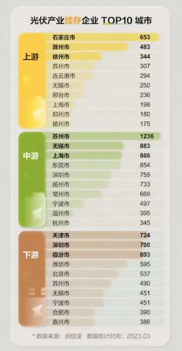 光伏产业在产品环节上已呈现明显分化格局,具体到光伏产业链上中下游TOP城市分布,江苏在上游优势明显,除石家庄、滁州外,TOP10城市中,徐州、苏州、连云港、无锡、扬州占据半壁江山。长三角和珠三角区域在中游发力,苏州、无锡、上海续存企业数量位列前三,东莞、深圳紧随其后。