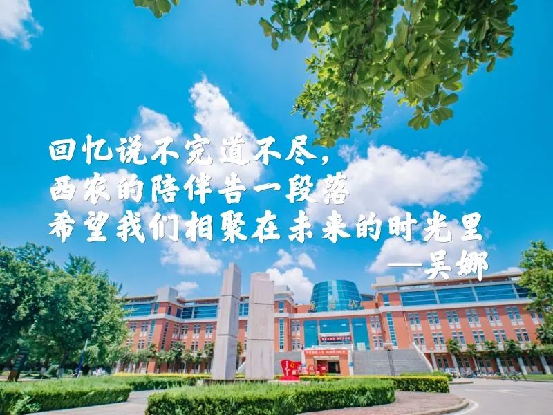 鲜衣怒马少年郎,青春浩荡饮琼浆。感谢西农陪我度过了七年的春秋,在这里我看到了更尽兴的景色,看到了山外的青山,见识到了更多人在经历高考千军万马后的激荡青春,看到了文采飞扬、勇敢无畏、志比鲲鹏的青春凯歌。做西农的孩子是我莫大的荣幸,感谢西农给我编织的明天的梦,再见西农,昭昭目目,峰回路转,长途远征,愿我在未来的柴米烟火的激荡人生中会依然快乐。