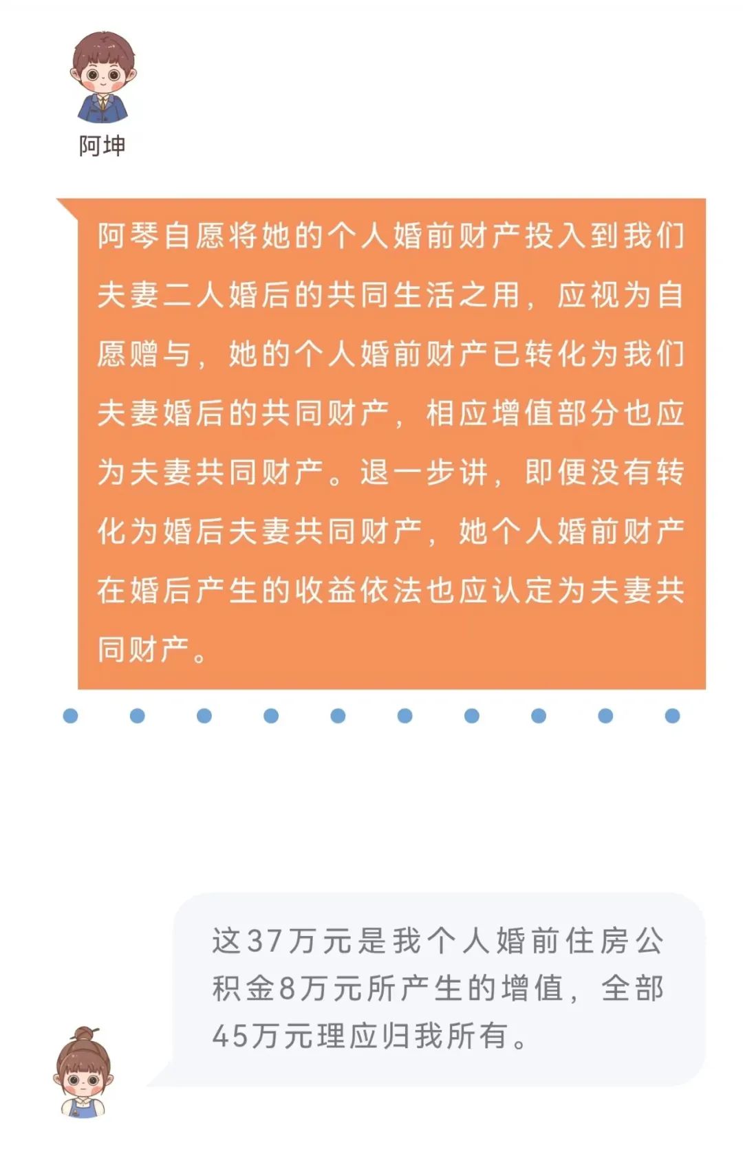 审理中,经鉴定,前述房产中由阿琴使用个人婚前住房公积金还贷所产生的房产增值部分为37万元,双方对阿琴投入的8万元及相应增值部分37万元的归属各执己见。
