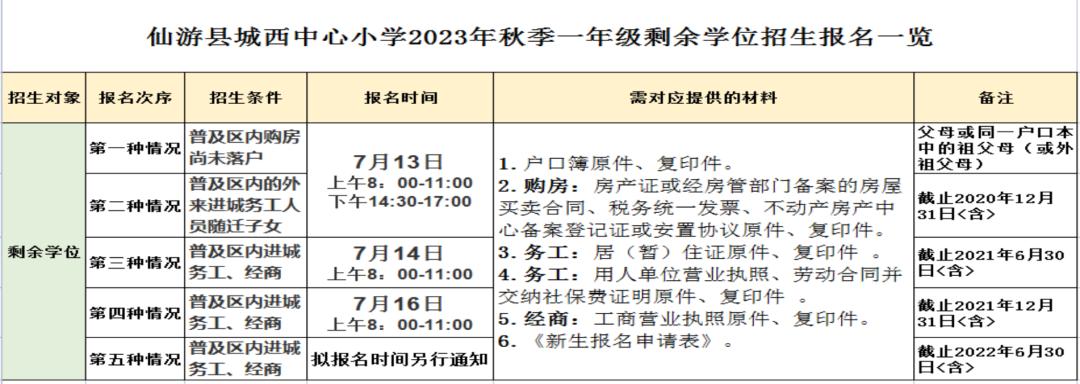仙游县城西中心小学一年级剩余学位招生通告