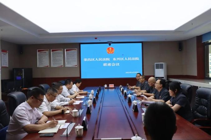 座谈会上,苏维院长对杨光明院长一行的到来表示热烈欢迎,并简要介绍东兴区法院的情况,结合东兴区法院审执质效工作情况,详细介绍东兴区法院诉源治理、积极参与基层治理等特色亮点工作。双方就案件繁简分流、智慧法院建设、机关党建结对、共建跨越类案检索和跨域专业法官会议机制等相关问题展开了深入交流和探讨。杨光明院长表示两地法院自签订框架协议以来共同推动双城经济圈建设取得的一定成效,此次来院交流学习,开展两地联席会议,是为了促进共同签署的5项合作协议落到实处、具体工作纵深推进,希望两家法院在今后的工作中持续加强沟通、深入交流,与时俱进推动川渝合作机制和工作机制迭代升级,围绕服务保障推动成渝中部地区高质量发展主题,推动川南渝西地区融合发展和内荣农高区建设需要进行更加务实合作,做到同题共答、同向发力,实现资源共享、优势互补、发展互助、合作共赢,为成渝地区双城经济圈荣东两地建设提供有力司法服务与保障。