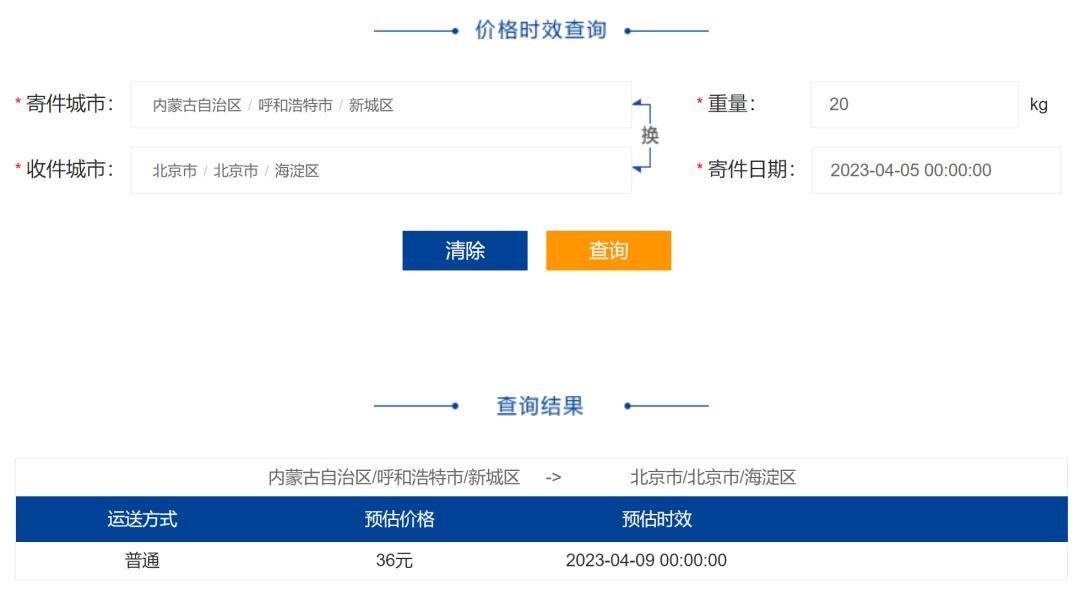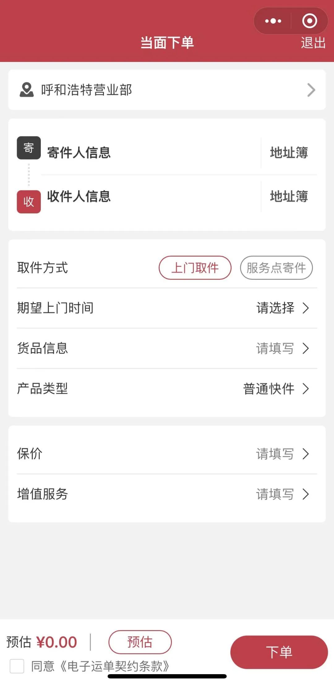 微信小程序搜索中铁快运,登录后选择服务网点,填写寄件人、收件人和物品信息,选择“上门取件”或者“服务点寄件”,可以看到预估费用等信息。