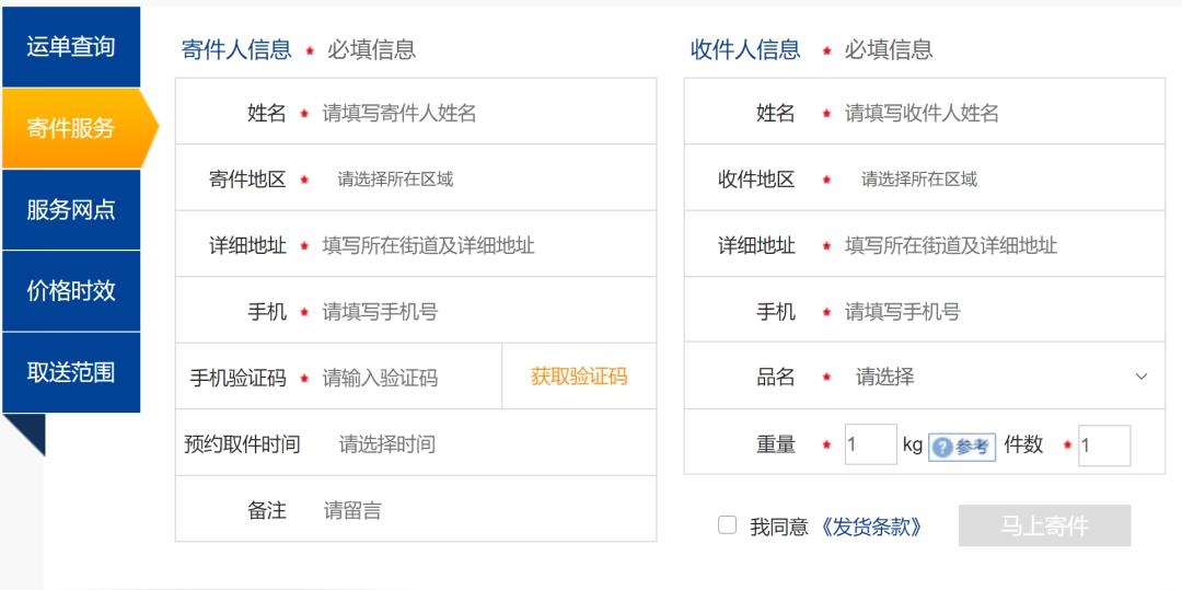 登录www.95572.com中铁快运官方网站,选择寄件服务,填写寄件人、收件人和物品信息,就可以寄件了。还可以查询时效价格、服务网点、取送范围等信息。