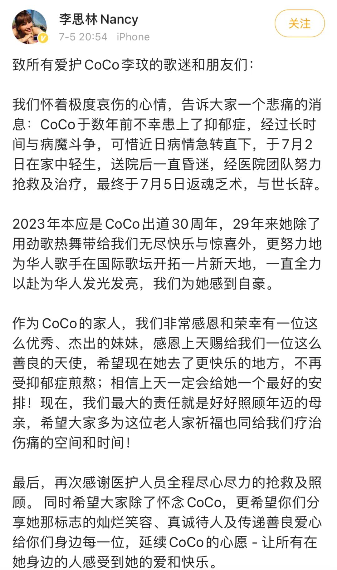7月5日,歌手李玟的姐姐@李思林Nancy 发文称,李玟于数年前不幸患上抑郁症,于7月2日在家中轻生,送院后抢救无效,最终于7月5日离世,时年48岁。
