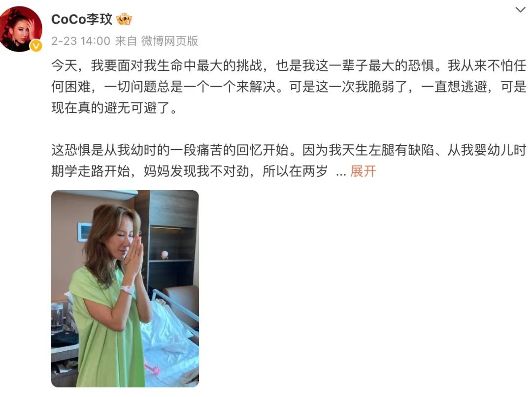(图/微博)因为出生时被过度拉拽,李玟的左腿天生患疾,一直以来她都是全靠右腿支撑着行走,甚至是跳舞。去年10月初在排舞时,李玟触及旧患髋关节移位,神经线被压住了无法移动,必须进行手术。