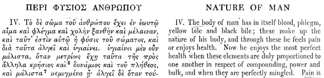 图1. 希波克拉底《人的本质》一书中关于四体液学说的段落。丨来源:Jones, W.H.S.(1931) Hippocrates, Volume IV: Nature of Man。
