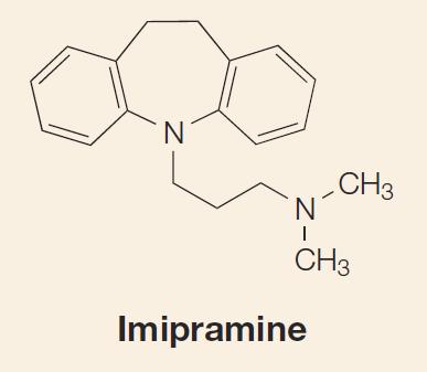 虽说抑郁症对人类健康的危害在古希腊时代就有记载,但直到晚近,现代医学对付精神类疾病的手段仍旧非常有限。第一个具有抗抑郁效果的化合物Iproniazid直到1954年才由几位肺病临床医生意外发现。这种单胺氧化酶 (monoamine oxidase,MAO) 抑制剂 (MAOI) 最初被用来尝试治疗肺结核,临床试验没有看到疗效,却意外发现Iproniazid有提升病人精力的“副作用”。可惜在抗抑郁临床试验成功和广泛用于抑郁症病人后没多久,Iproniazid 就因为发现具有肝脏毒性而被迫停止使用。值得庆幸的是,按照MAOI思路研制的第二个抗抑郁药物Imipramine很快在1957年取得成功,这是一个具有三环结构的化合物 (图4)。Imipramine对60%到70%的抑郁症病人有效,至今依然是精神科医生的治疗手段之一。