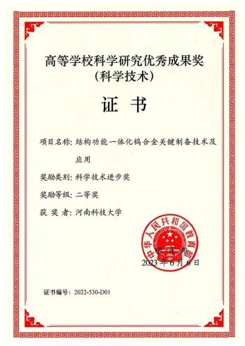 河南科技大学金属材料磨损控制与成型技术国家地方联合工程研究中心徐流杰教授牵头完成的“结构功能一体化钨合金关键制备技术及应用”项目,获2022年度教育部高等学校科学研究优秀成果奖——科技进步二等奖,填补了该校教育部科技进步奖的空白。