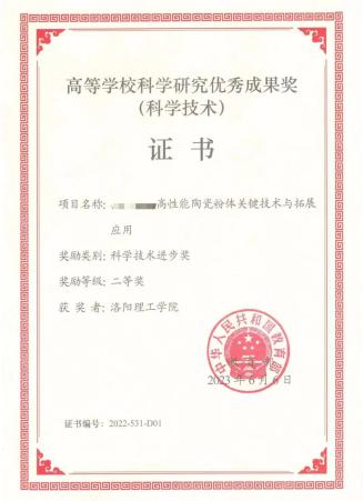 高等学校科学研究优秀成果奖(科学技术)是由教育部设立的用以鼓励在推动科学技术进步中做出突出贡献的高等学校的教师、科技工作者和科研组织的奖项,是仅次于国家自然科学奖、国家技术发明奖和国家科技进步奖三大奖的重要科技奖项。其评审面向全国高等院校,由全国同行专家审议选定,竞争激烈。高等学校科学研究优秀成果奖(科学技术)设有自然科学奖、技术发明奖、科学技术进步奖和青年科学奖。其中,河南科技大学、洛阳理工学院分别获得科技进步二等奖。