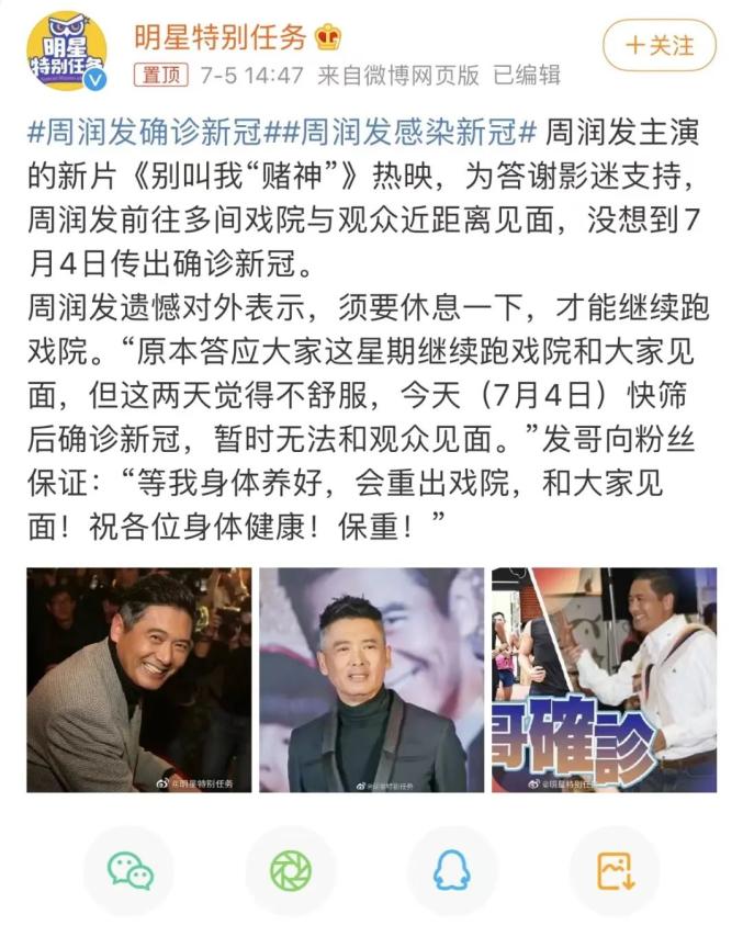 周润发主演的新片《别叫我“赌神”》热映,为答谢影迷支持,周润发前往多间戏院与观众近距离见面,没想到7月4日传出确诊新冠。