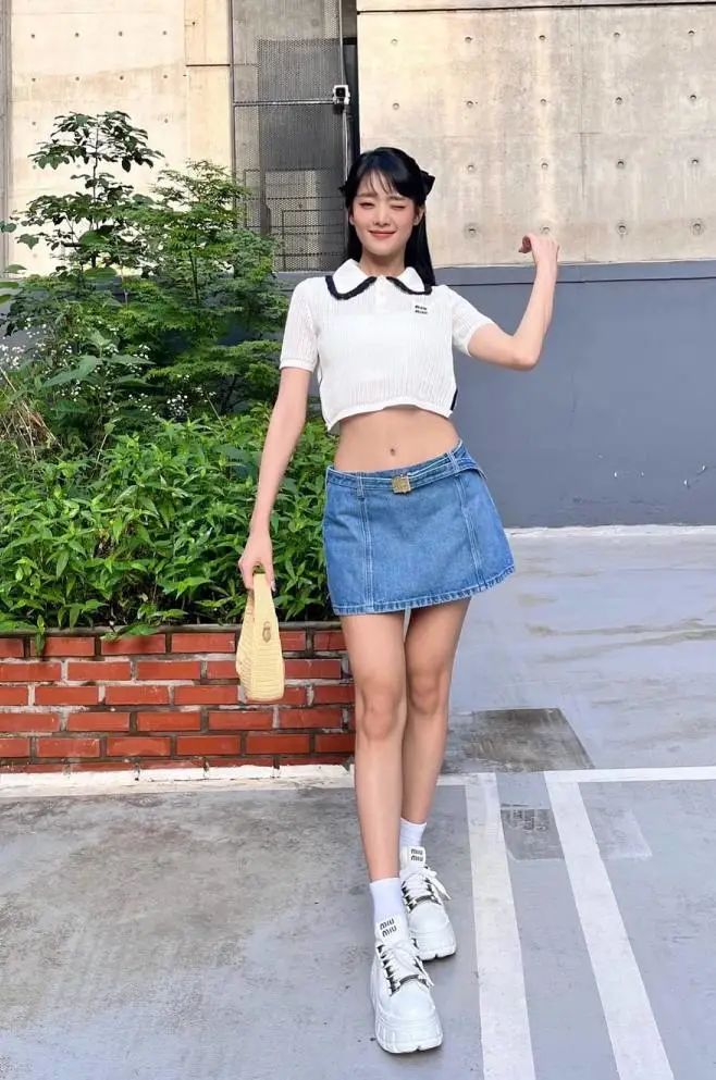 牛仔百褶短裙不仅能够修饰胯部瑕疵,偏 A 版型还是腿粗女孩的福音,与 Angelababy 一样上身简单搭配个吊带就能将身材优势完美呈现。