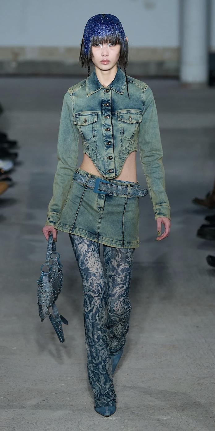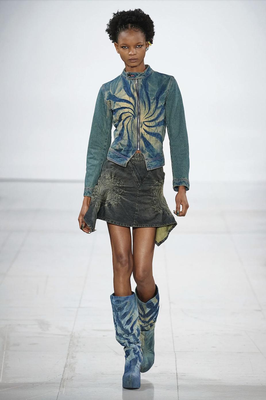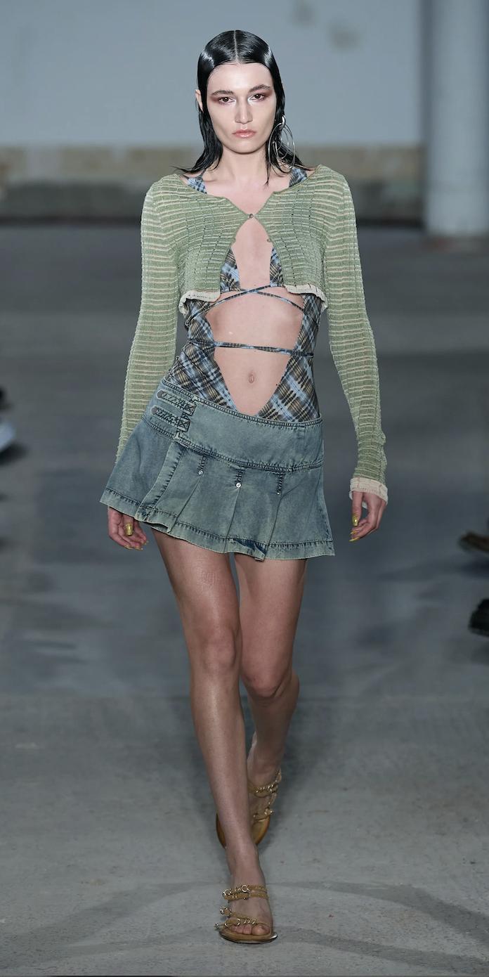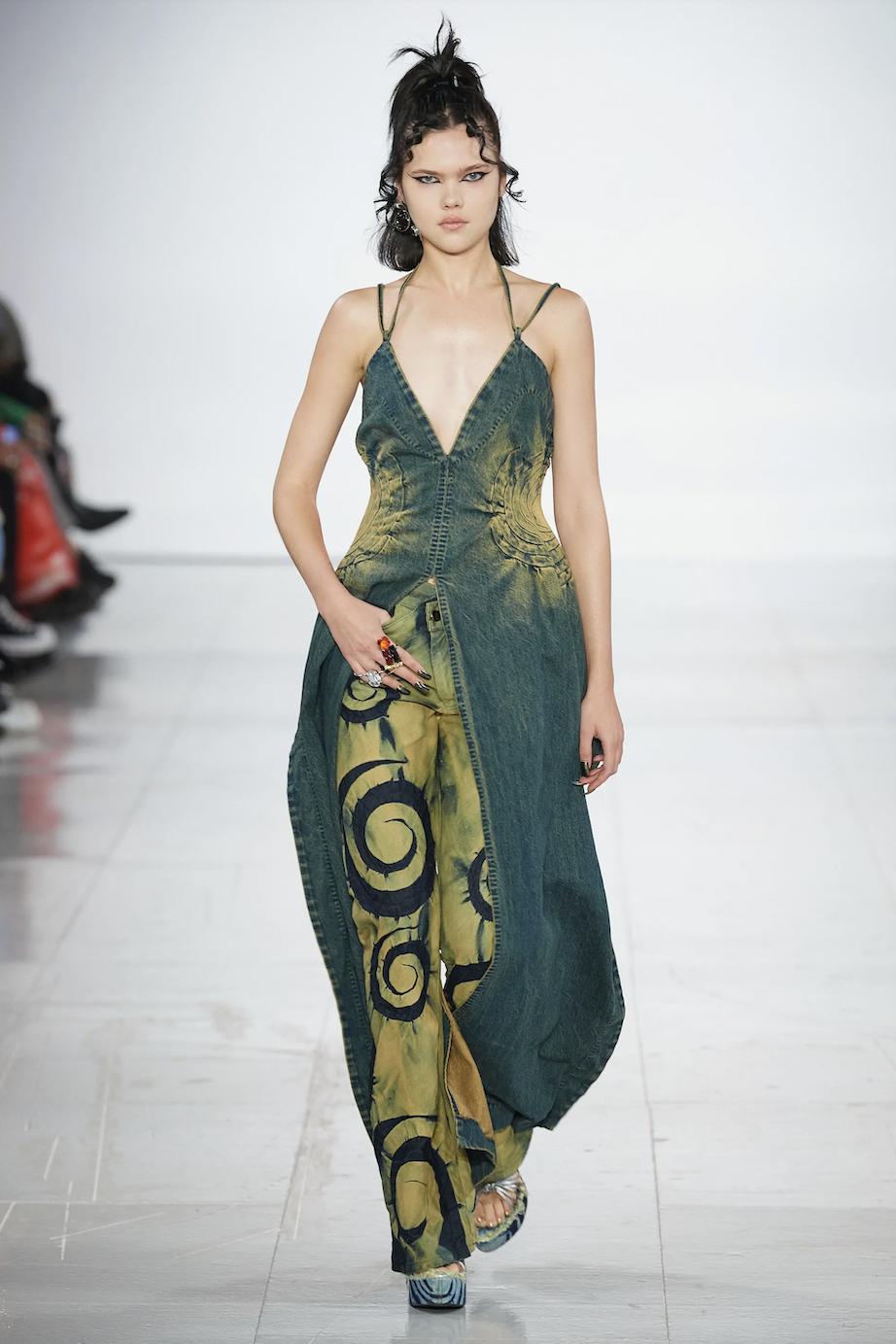 Knwls Spring 2023 Ready-to-Wear镂空元素、废土色调、水洗纹理,满场秀都在弥漫的怀旧色调通过新的角度重新定义 Y2K。不规则裁剪和与众不同的印花长裤形成独特视觉碰撞,带有摇滚感的墨镜和发色也毫不冲突,让人眼前一亮。