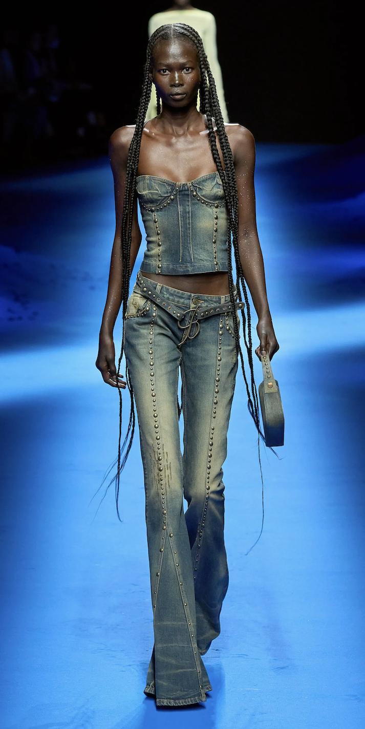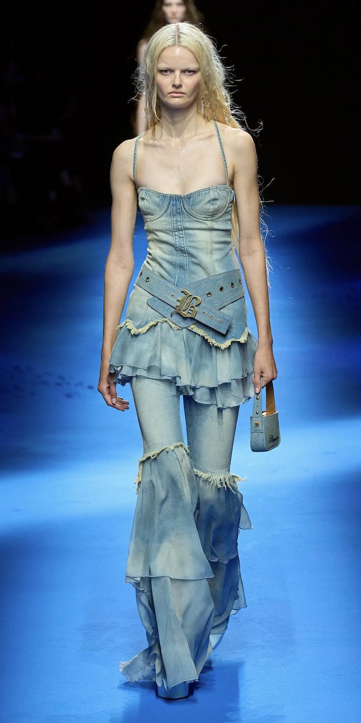 Blumarine Spring 2023 Ready-to-Wear今年春夏系列中,品牌设计的裙子多以束身款式为主,整体紧身流线型廓形再加上铆钉搭配,兼具酷飒和性感。牛仔和薄纱想组和更是创意十足,软硬巧妙交织,颇有大胆玩味的感觉。