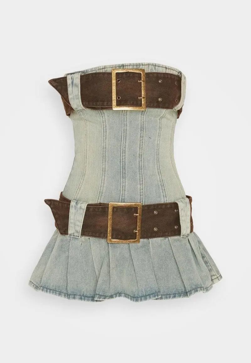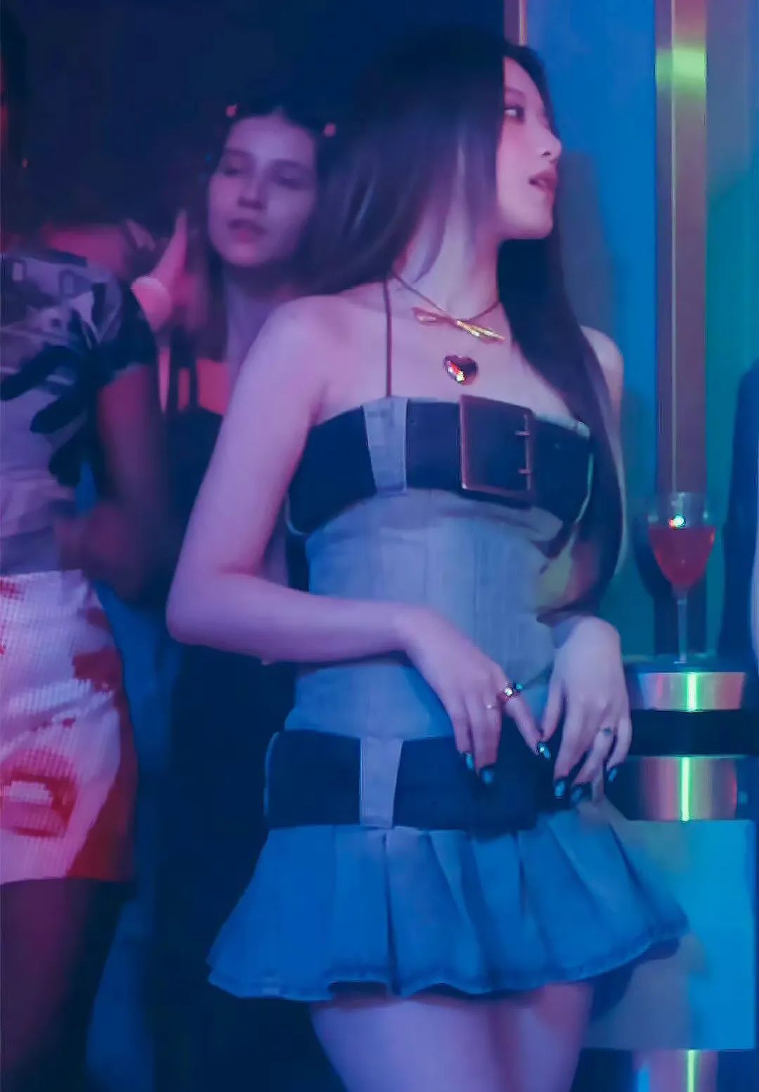 当时叶舒华在 MV 中的这一幕戳中了多少人的审美点?一袭Jaded London水洗做旧抹胸牛仔裙甜酷又带点 Y2K 的叛逆。精湛剪裁体现出她纤薄腰部,腰带加持更是将完美曲线勾勒得淋漓尽致,个性又不羁的造型与歌曲理念契合满分。赵露思
