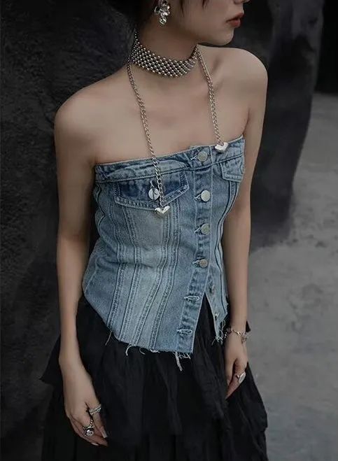 如果问辣妹最爱的单品是哪个,那抹胸绝对是当之无愧的首榜。牛仔的叛逆和抹胸的性感相辅相成,甜酷少女轻松拿捏。