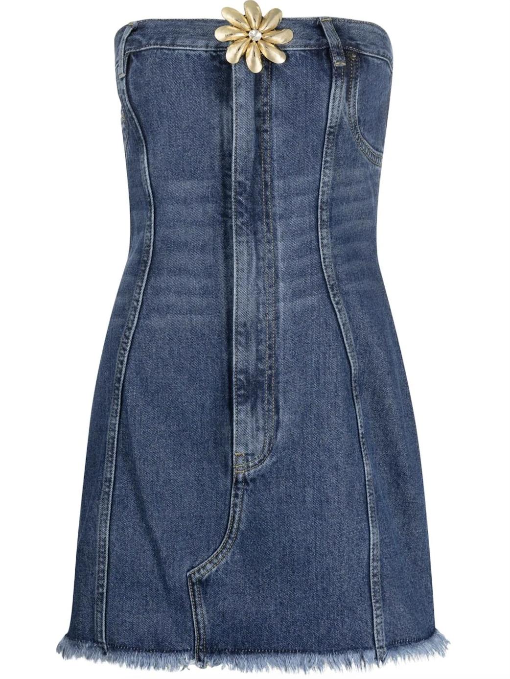周洁琼选择了Area深蓝色牛仔抹胸裙,深色的使用为造型加了些许神秘和优雅气质,胸口处小黄花是亮点,在成熟中保留青春活力,也避免了整体过于单调,于和谐中实现统一。