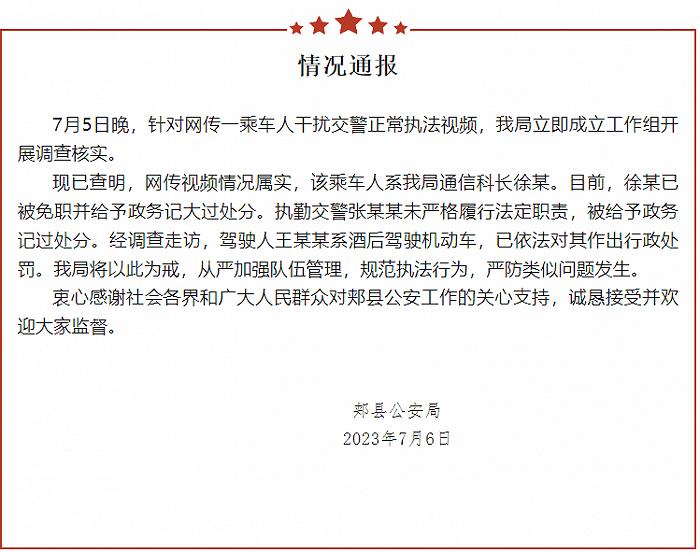 更吊诡的是,这一视频是由一位当地被辞退的辅警发布。在全国舆论热议中,当地匆匆发布了处理结果。徐大科长被免职,行政记大过。执勤交警张某某未严格履行法定职责,被给予政务记过处分。驾驶人王某某系酒后驾驶机动车,已依法对其作出行政处罚。