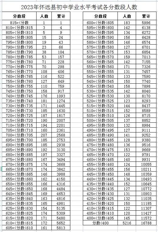 今年怀远县共有16788人报名参加中考,相比去年增加了864人。今年和去年一样,中考总分包括中考文化课、初二生物地理、体育考试和理科实验操作,合计仍为850分。今年中考总分从五分一段分档表来看,800分以上(含800分)的考生有24人,700分以上(含700分)的考生有2568人。