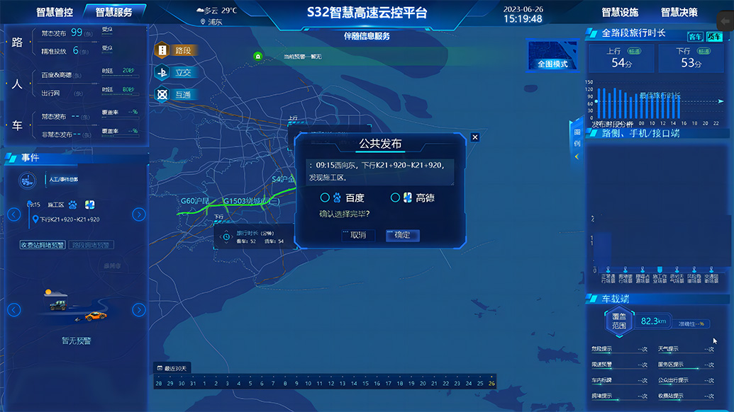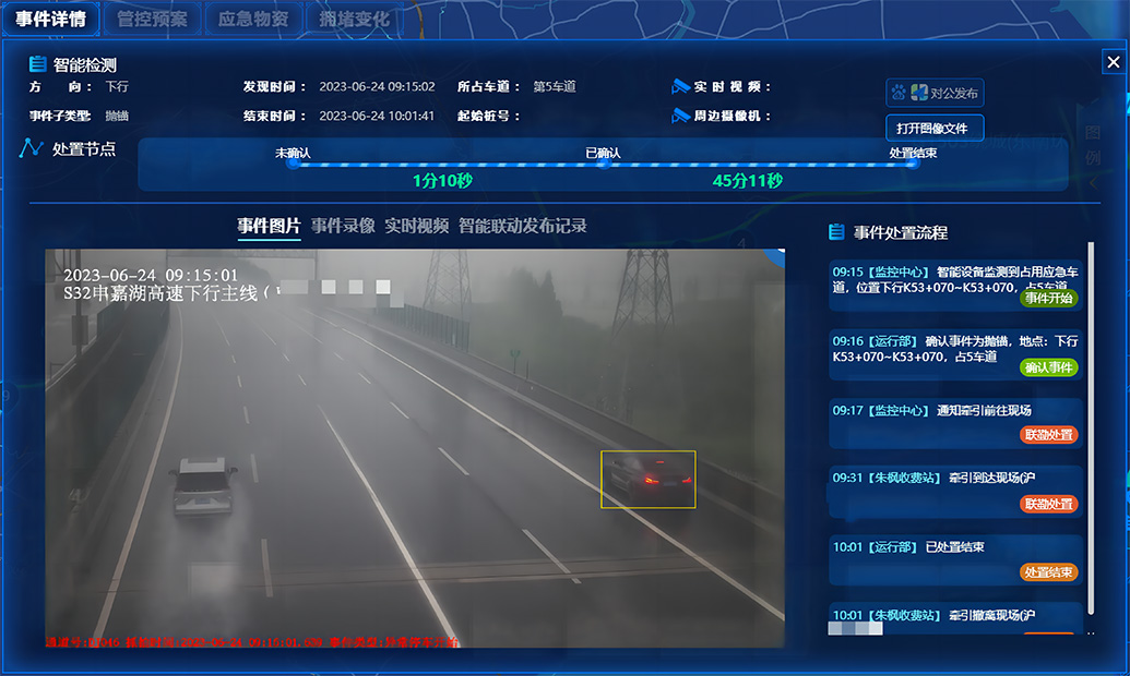 在全要素感知数据的基础上,面对道路拥堵、交通事故、施工作业等全场景和雨雾、积水结冰等全天候环境,S32申嘉湖智慧高速构建了全时空车道级主动交通管控体系,形成了一套高速公路综合监控、集成指挥、高效协同的运营管理系统。基于大数据和在线仿真的实时推演可以预测最优的交通应急管控方案,自动生成最佳管控范围,使得应急指挥全面智慧化、全程数字化,同步共享至各个协同部门,有效提升高速公路面对突发事件时的应急响应效率和协同管控水平,有力保障应急场景下的通行安全。