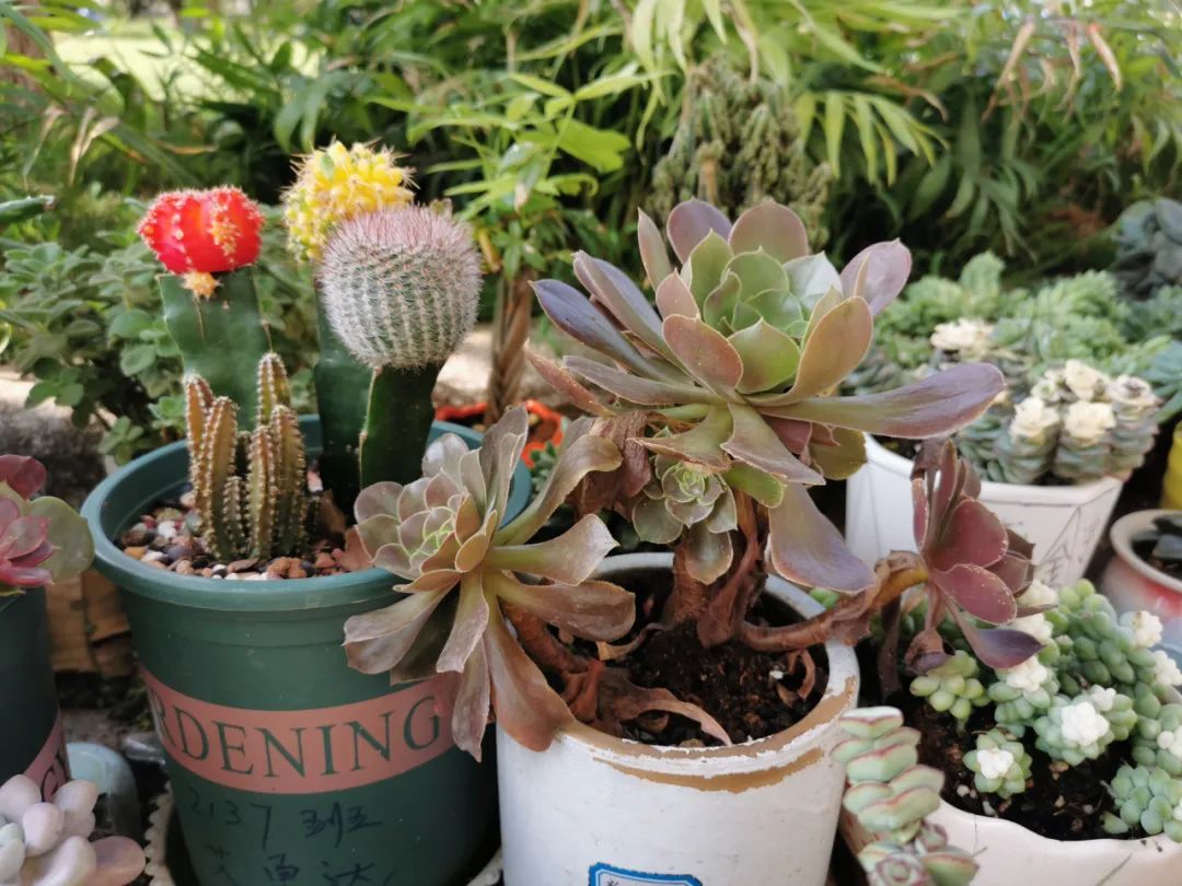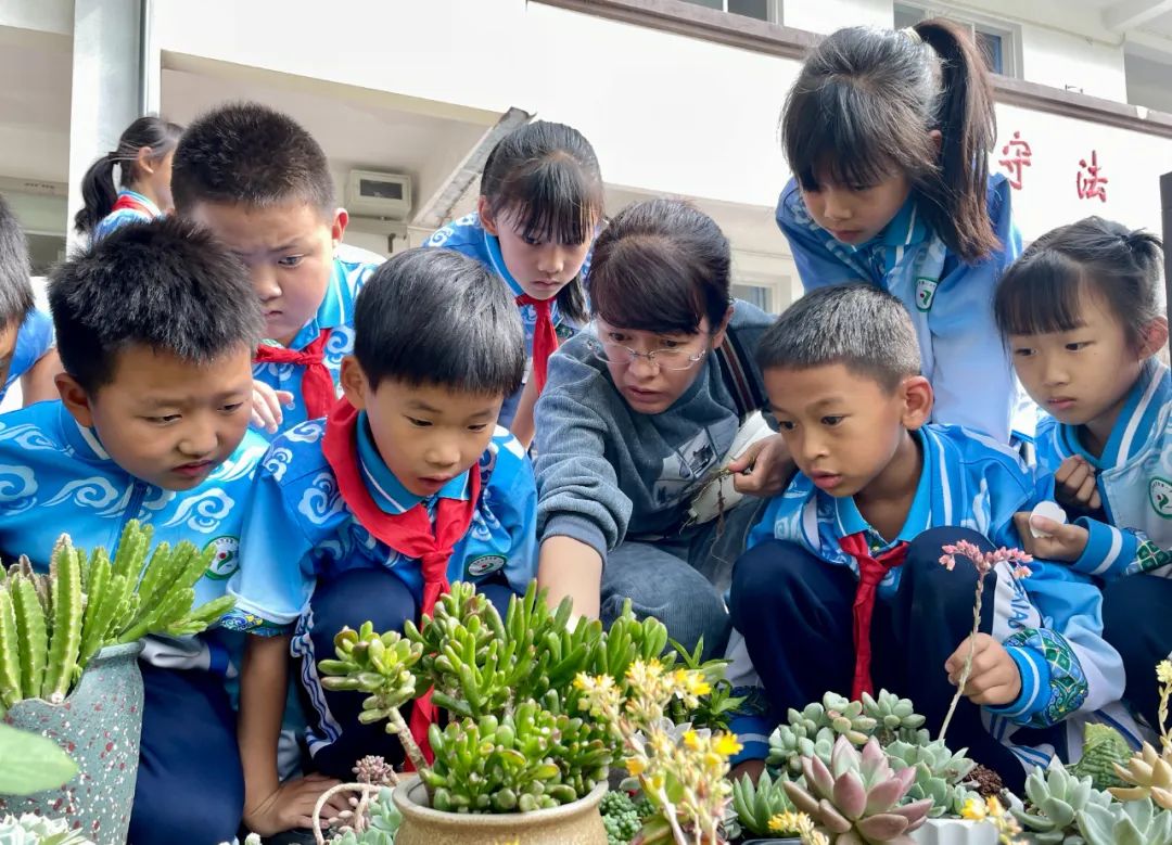 在教学楼前的“拼多多”植物角,摆满了月季、仙人掌、菊花等各式各样的植物。全校6个年级70个班级的学生将心爱的盆栽带到学校,为校园构筑出一道亮丽的绿色风景线。在课余时间,孩子们还会听老师讲解绿植种养知识,并为绿植浇水、除草、施肥,精心呵护一花一叶。