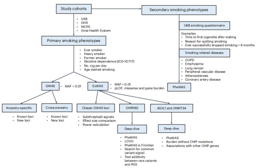 ASXL1和DNMT3A基因与大多数吸烟表型显著相关,并且这些关联与克隆性造血有关。克隆性造血是岁年龄增长而积累的体细胞突变,这表明吸烟可能对这些突变提供了克隆优势。