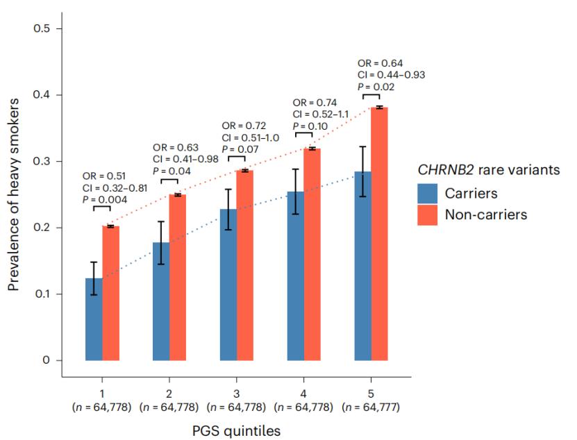 研究人员还讨论了常见突变和罕见突变在吸烟行为中的累加效应。以吸烟多基因得分(PGS)来表示一个人重度吸烟的风险,PGS得分越高越有可能是重度吸烟者。分析结果显示,无论个体是否携带CHRNB2罕见突变,重度吸烟者的患病率都随着PGS得分增加而增加;但是CHRNB2基因的罕见突变对吸烟行为具有保护作用,罕见突变携带者的重度吸烟几率低于非携带者(OR=0.65)。