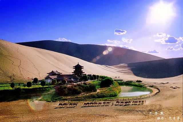 酒泉鸣沙山月牙泉酒泉地处甘肃省河西走廊西端,以“城下有泉、其水若酒”而得名。酒泉,山脉连绵,戈壁浩瀚,盆地毗连,构成了雄浑独特的西北风光;这里是敦煌艺术的故乡、现代航天的摇篮、新中国石油和核工业的发祥地、“铁人”王进喜的故乡和“铁人精神”的诞生地;这里既有银装素裹的冰川雪景,也有碧波溪流的平原绿洲,还有沙漠戈壁的海市蜃楼。