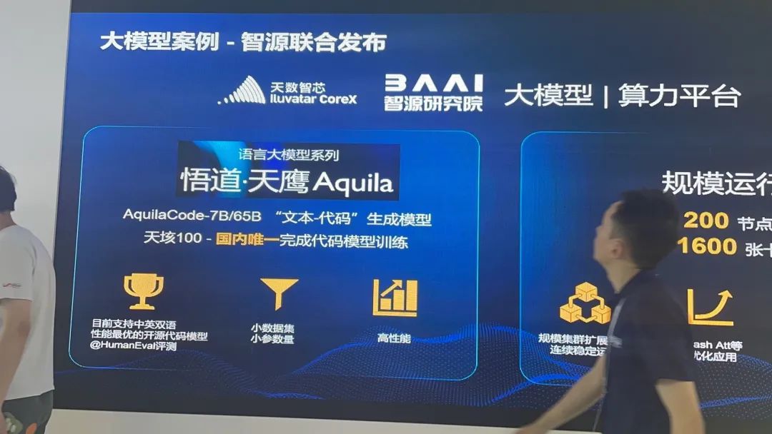 天数智芯带来了通用GPU训练产品“天垓100”和推理产品“智铠100”,以及大模型训练、推理以及20+行业应用案例。据工作人员介绍,上半年智源研究院曾推出70亿参数大模型,其全量训练依靠320张天垓100加速卡搭建的算力集群,这是目前唯一支持大模型完整训练的国产通用 GPU。
